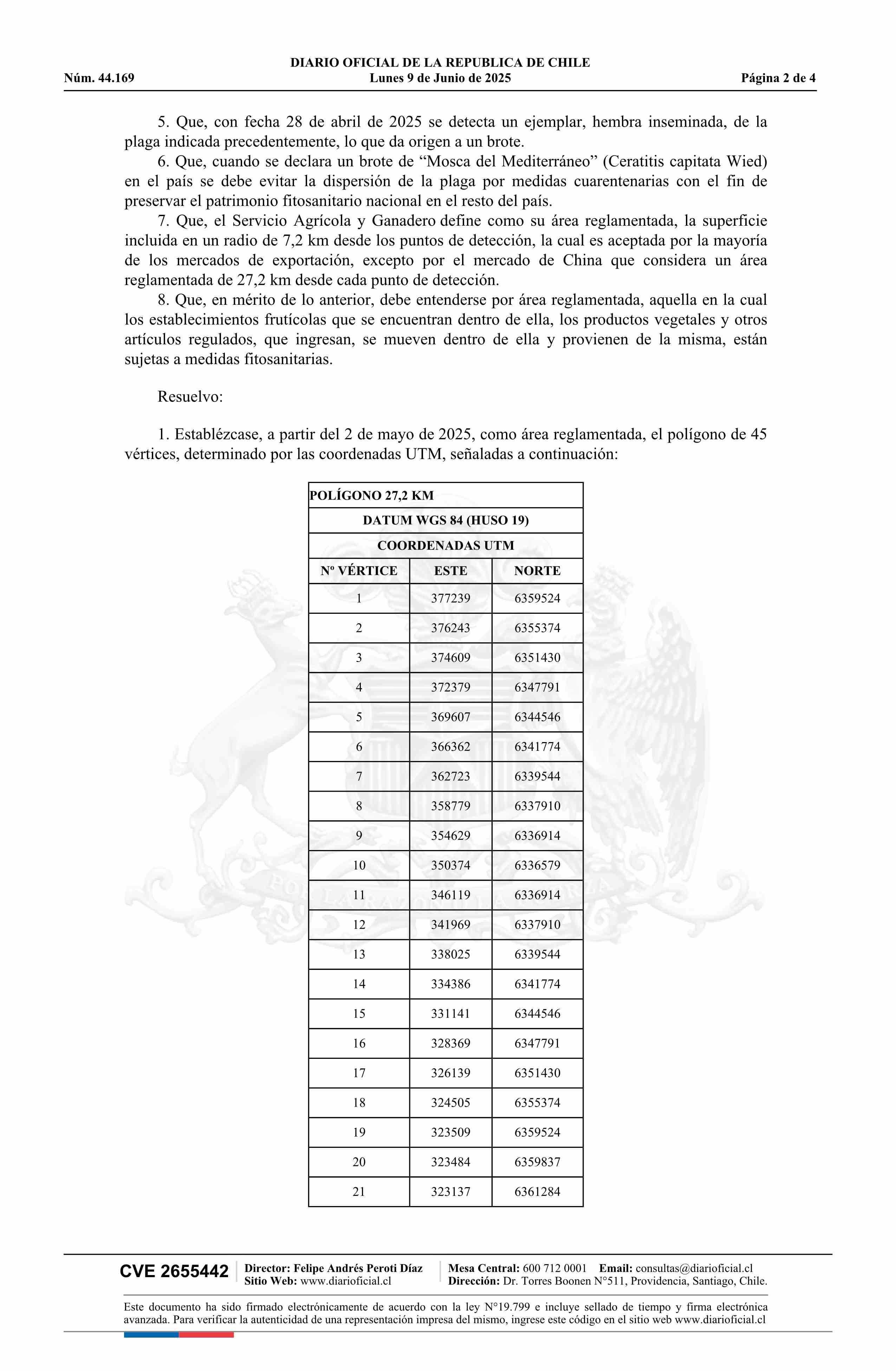 | Título: | Resolución exenta número 1.171, de 2025.- Establece regulaciones cuarentenarias para el control y erradicación de la Mosca del Mediterráneo (Ceratitis capitata W.) en los lugares que indica |