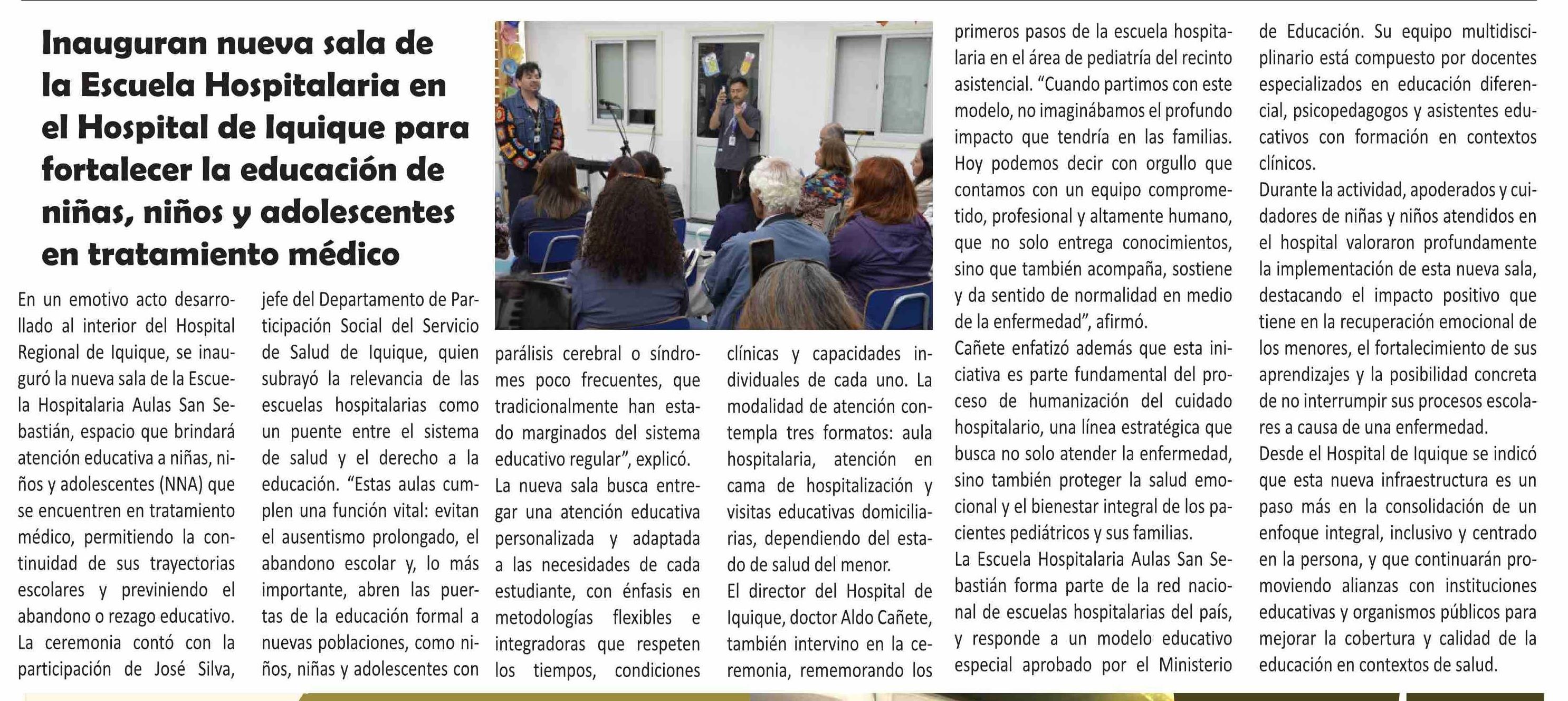 Título: En un emotivo acto desarrollado al interior del Hospital Regional de Iquique, se inauguró la nueva sala de la Escuela Hospitalaria Aulas San Sebastián, espacio que brindará atención educativa a niñas, niños y adolescentes (NNA) que se encuentren en tratamiento médico, permitiendo la continuidad de s