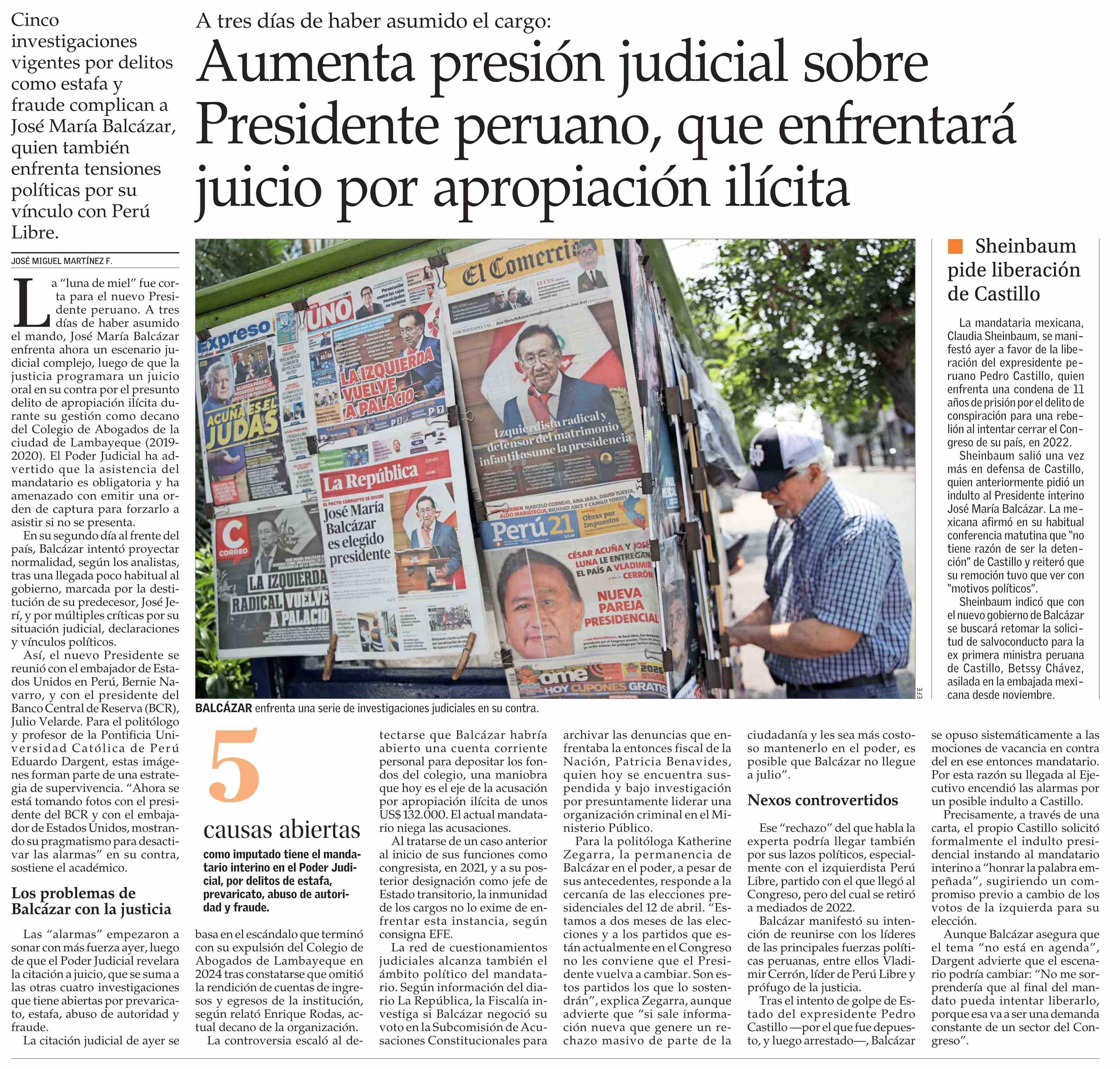 Aumenta presión judicial sobre Presidente peruano, que enfrentará juicio por apropiación ilícita