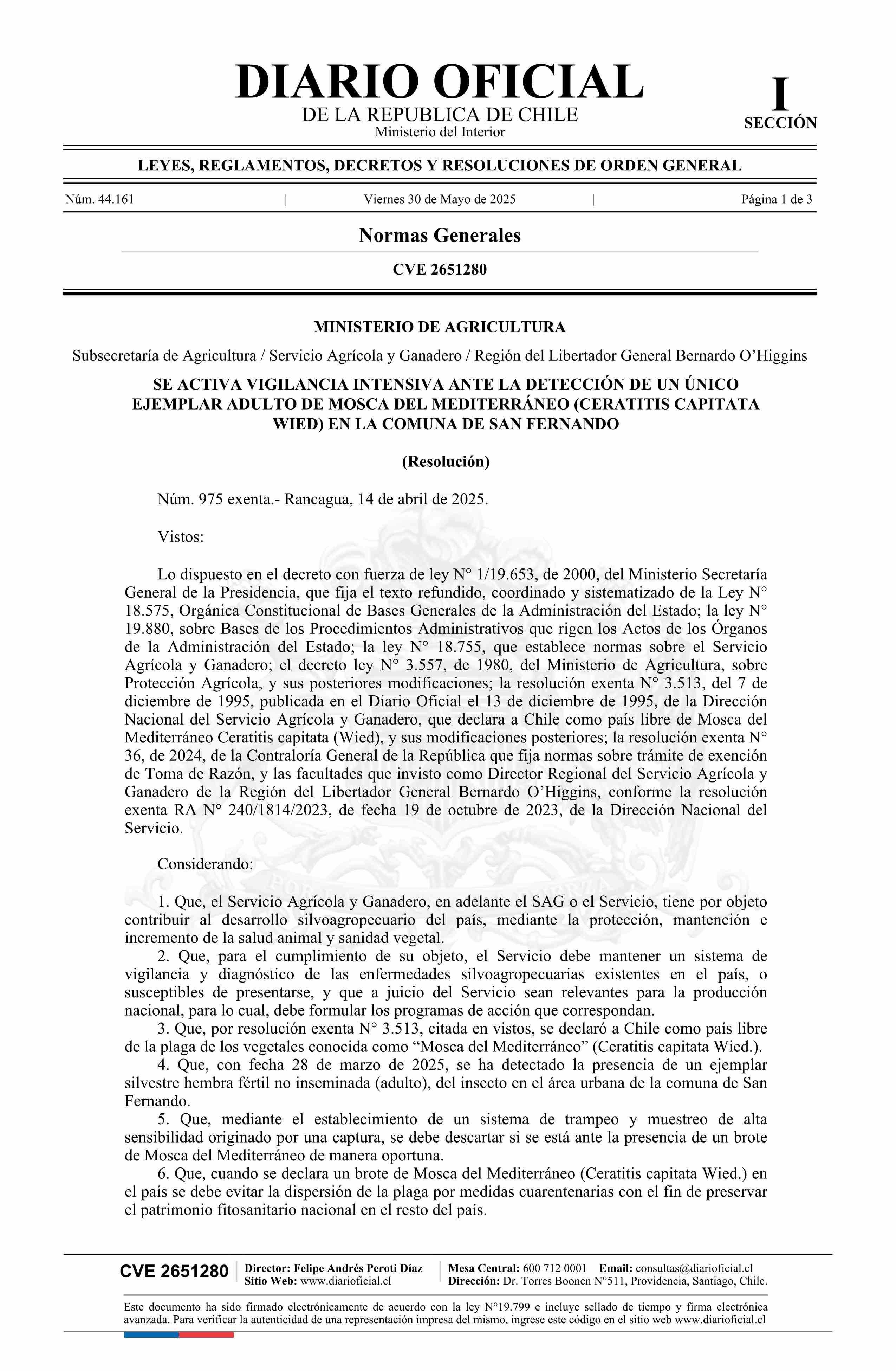 | Título: | Resolución exenta número 975, de 2025.- Activa vigilancia intensiva ante la detección de un único ejemplar adulto de Mosca del Mediterráneo (Ceratitis capitata Wied) en la comuna de San Fernando |