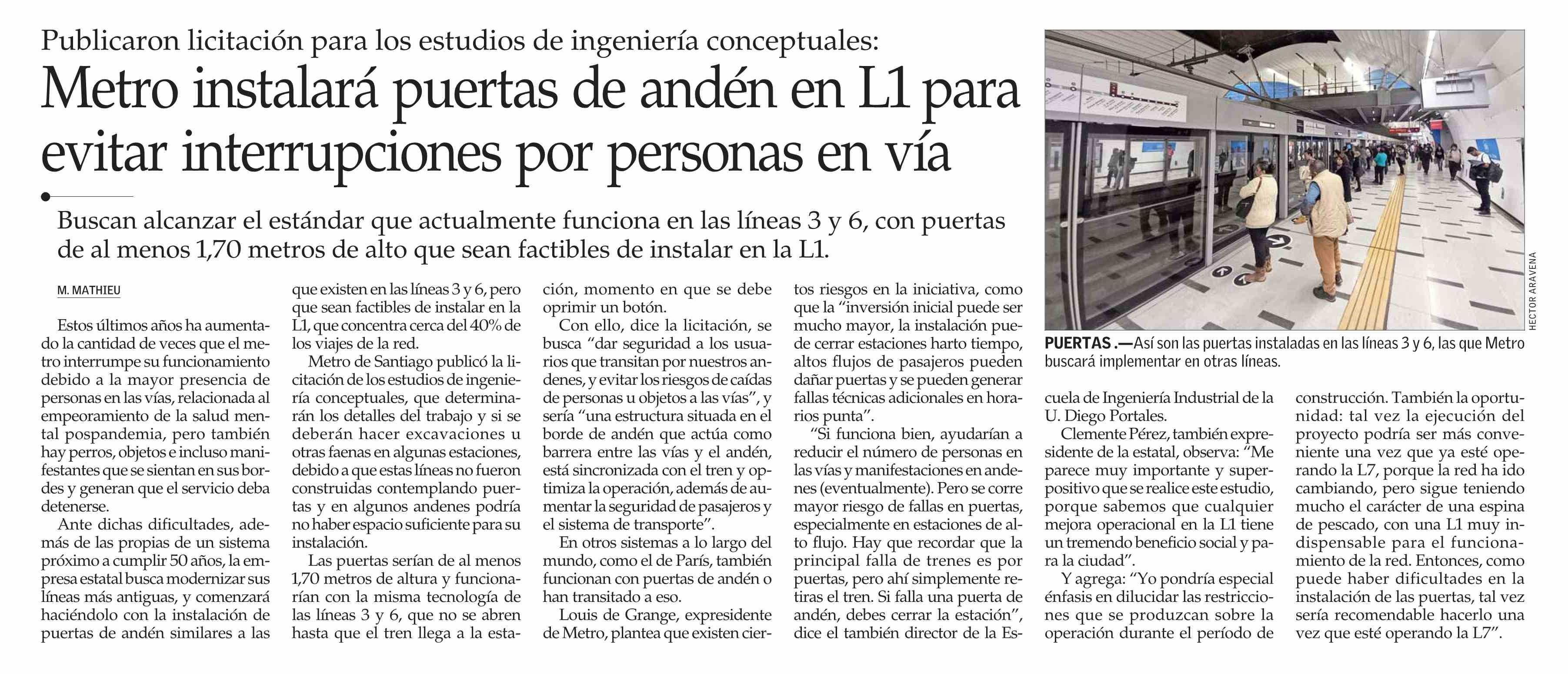 Metro instalará puertas de andén en L1 para evitar interrupciones por personas en vía