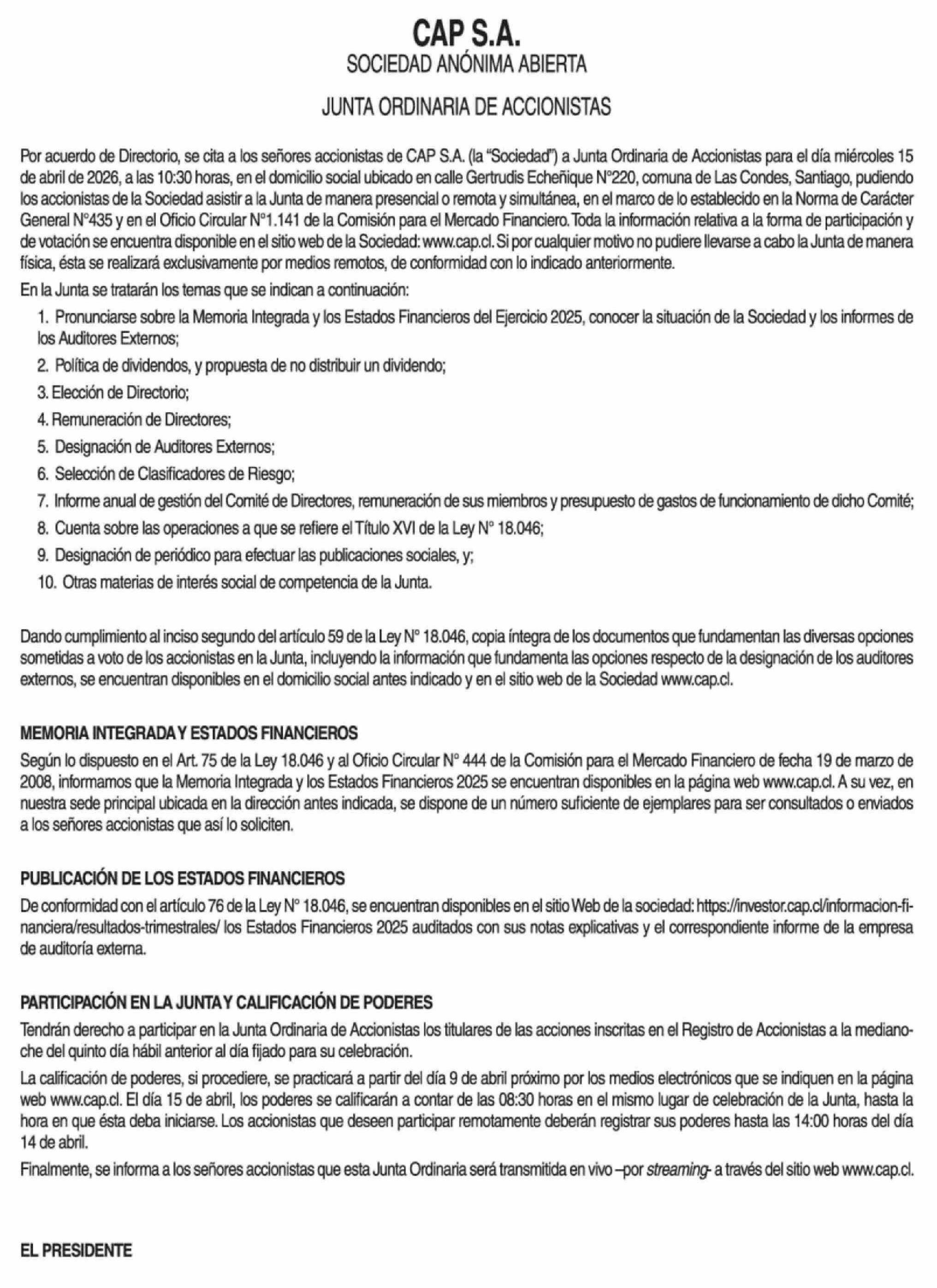 Extractos: CAP S.A. SOCIEDAD ANÓNIMA ABIERTA JUNTA ORDINARIA DE ACCIONISTAS