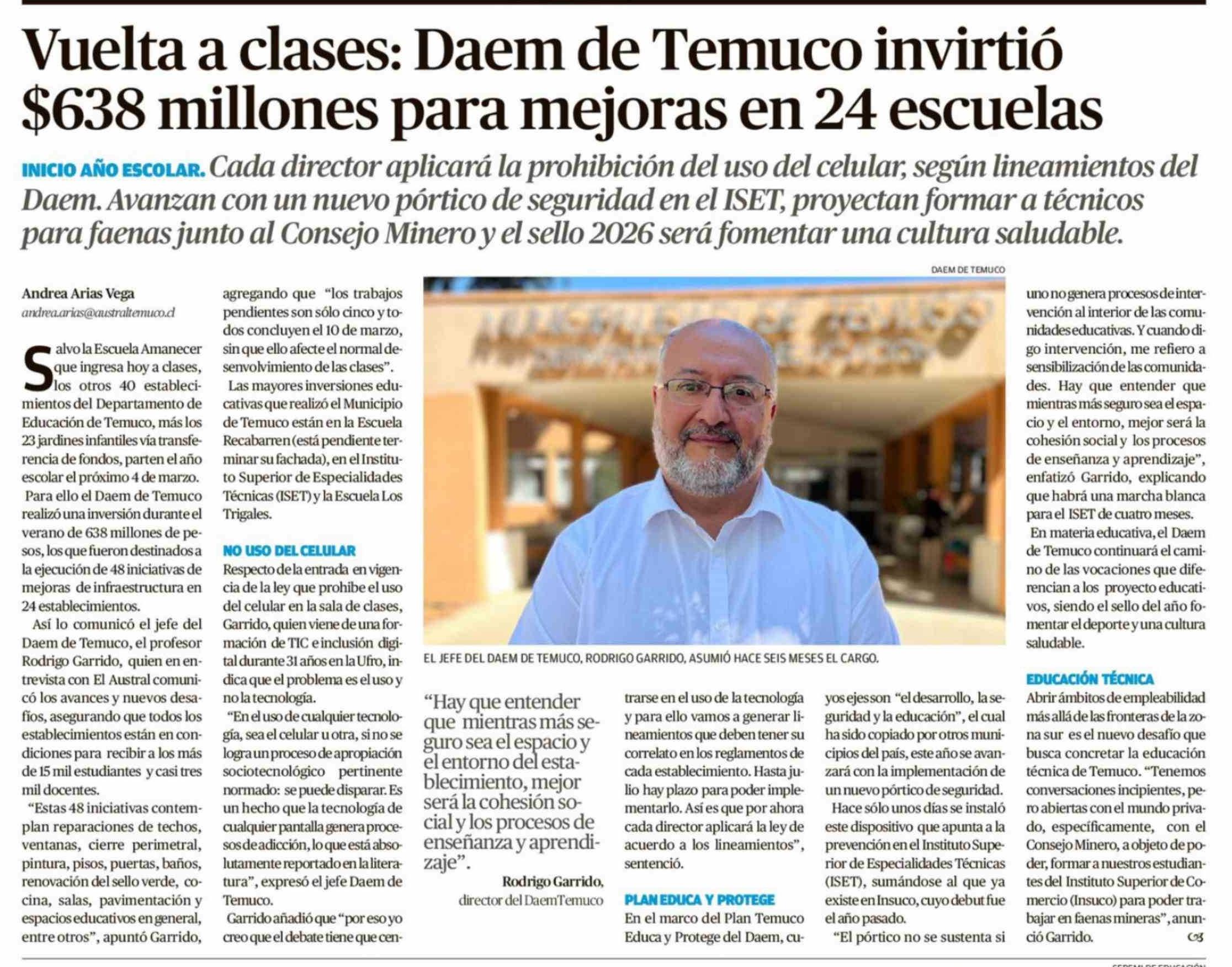 Título: Vuelta a clases: Daem de Temuco invirtió $638 millones para mejoras en 24 escuelas