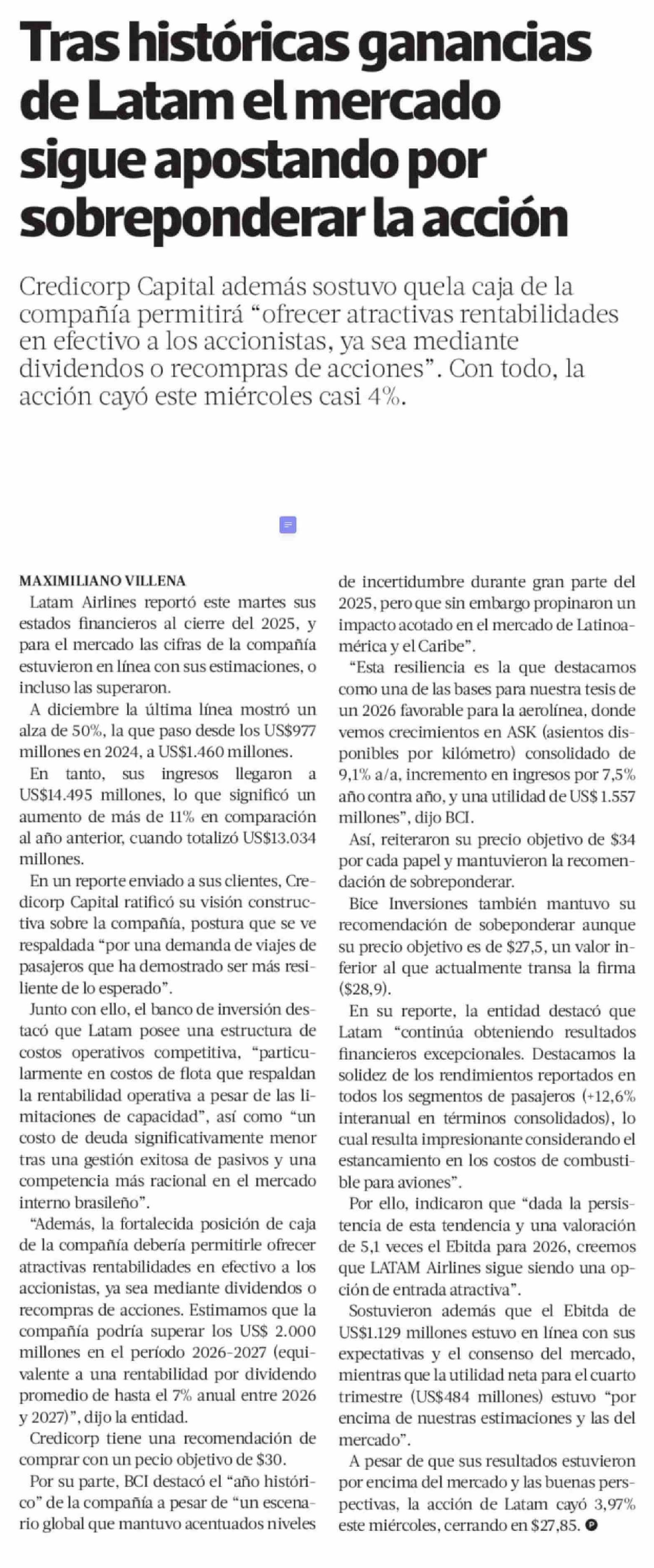 Tras históricas ganancias de Latam el mercado sigue apostando por sobreponderar la acción