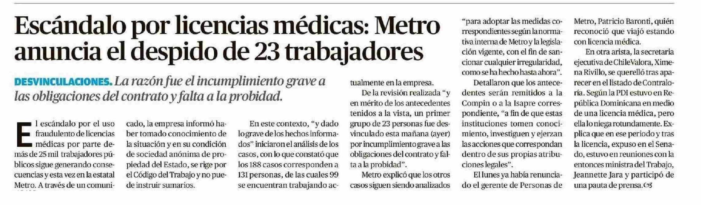 Escándalo por licencias médicas: Metro anuncia el despido de 23 trabajadores