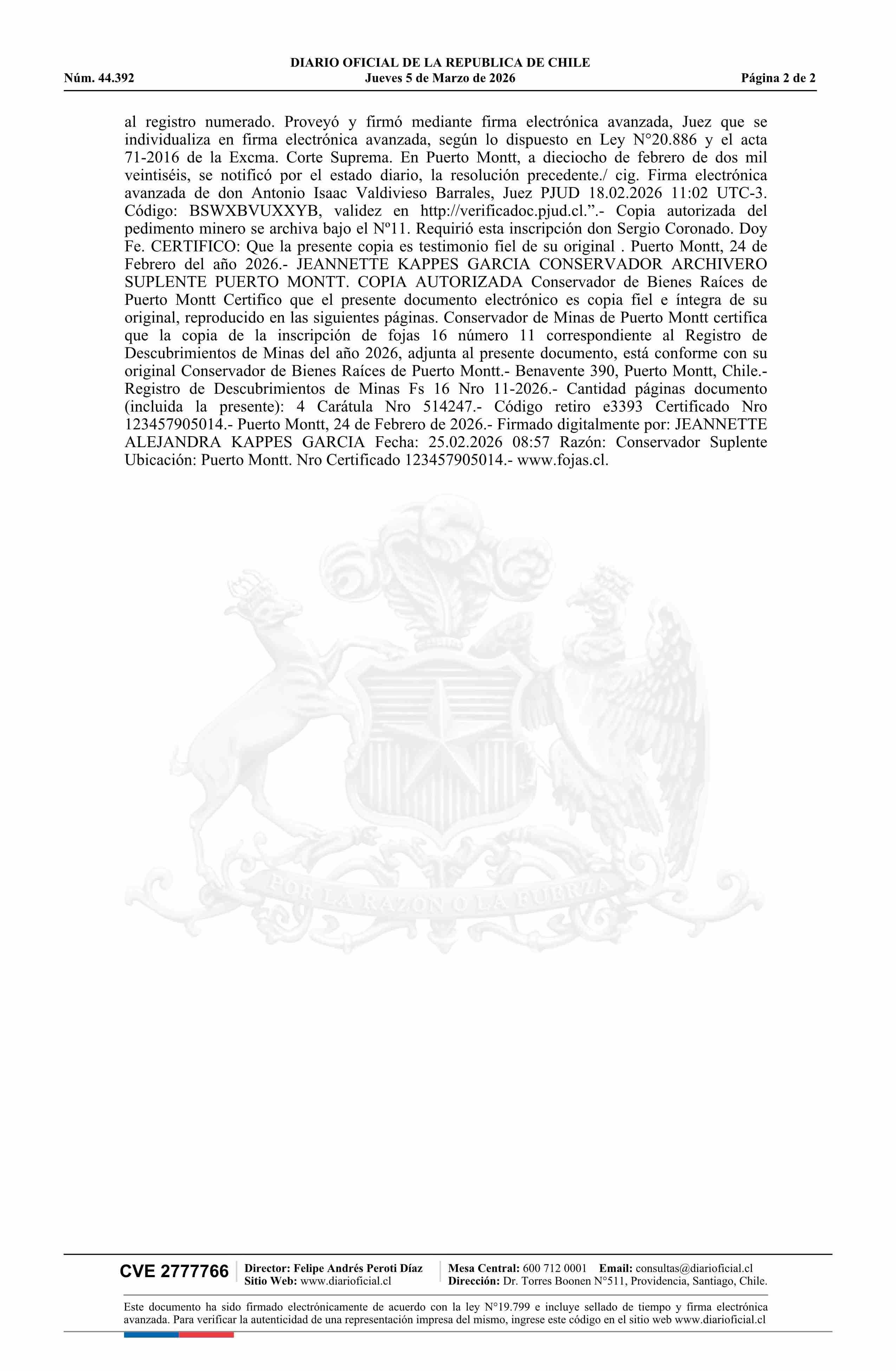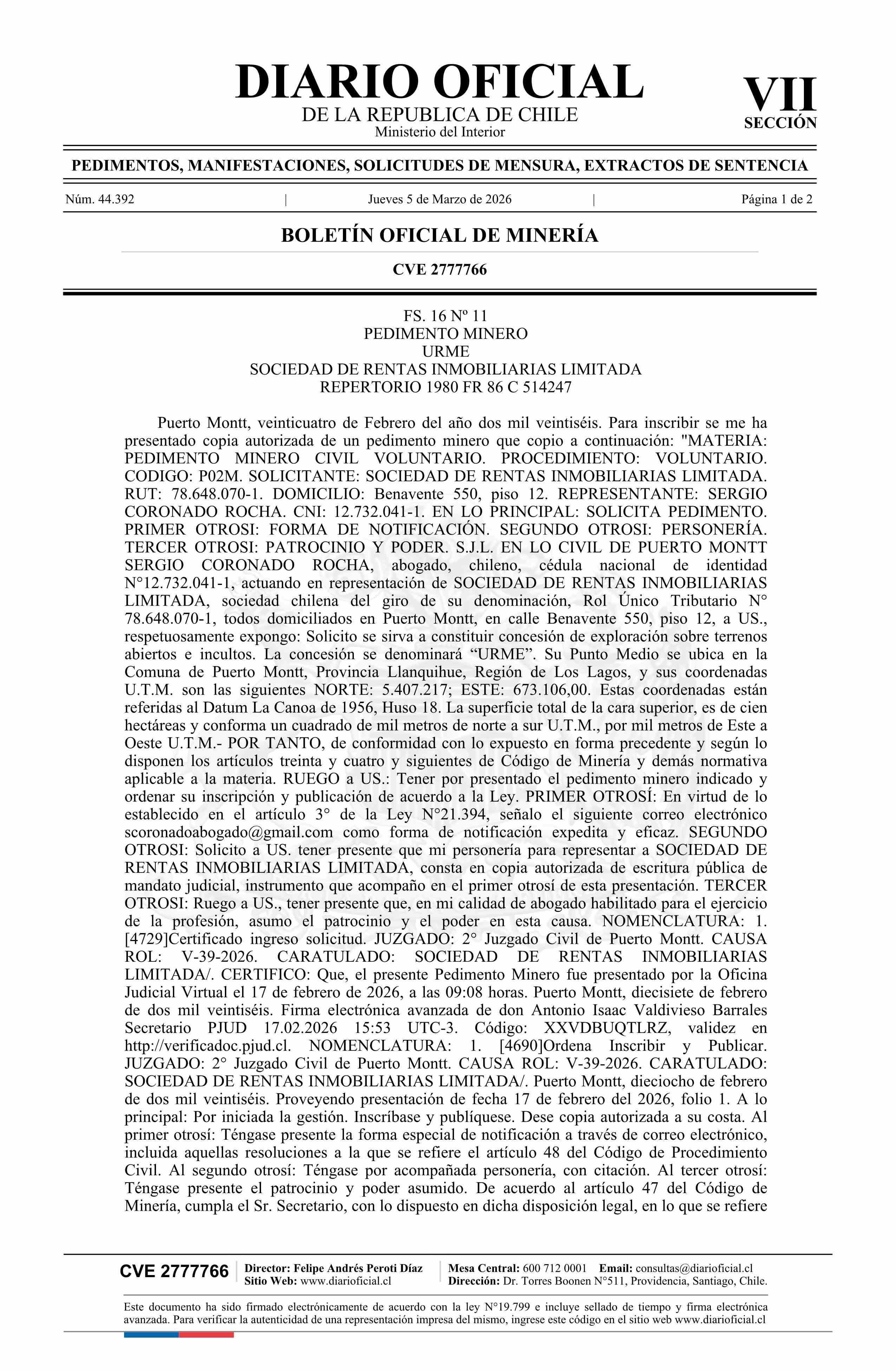 DIARIO OFICIAL CHILE - BOLETÍN OFICIAL DE MINERÍA (DIARIO OFICIAL CHILE – BOM – PEDIMENTOS MINEROS)
