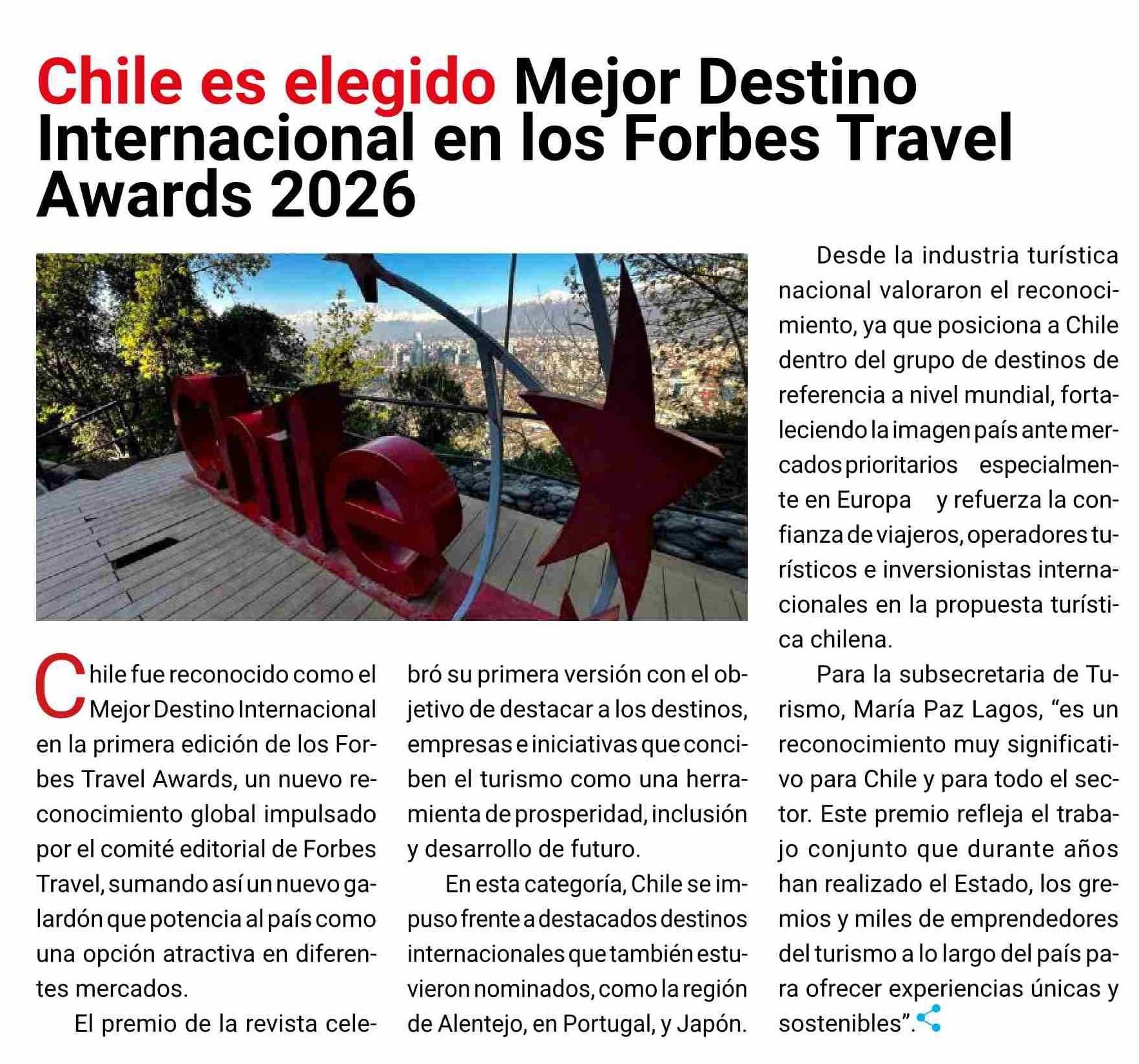 Chile es elegido Mejor Destino Internacional en los Forbes Travel Awards 2026