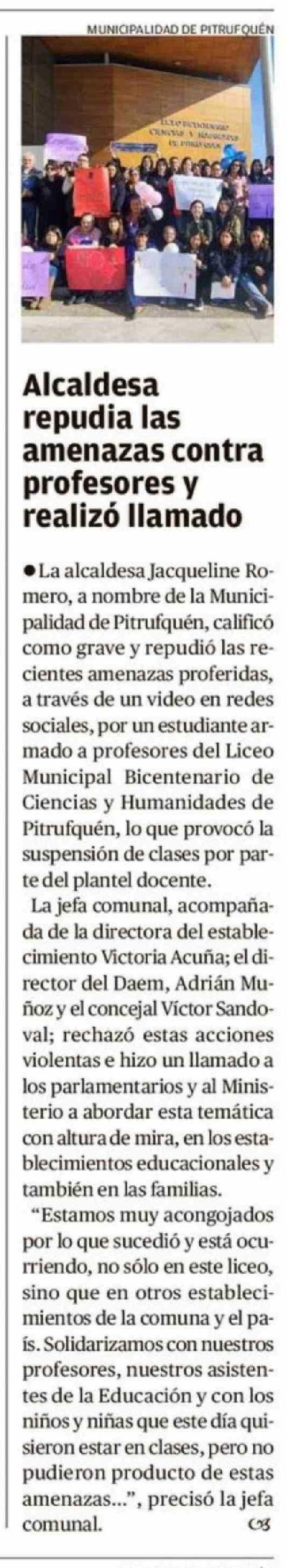 Alcaldesa repudia las amenazas contra profesores y realizó llamado