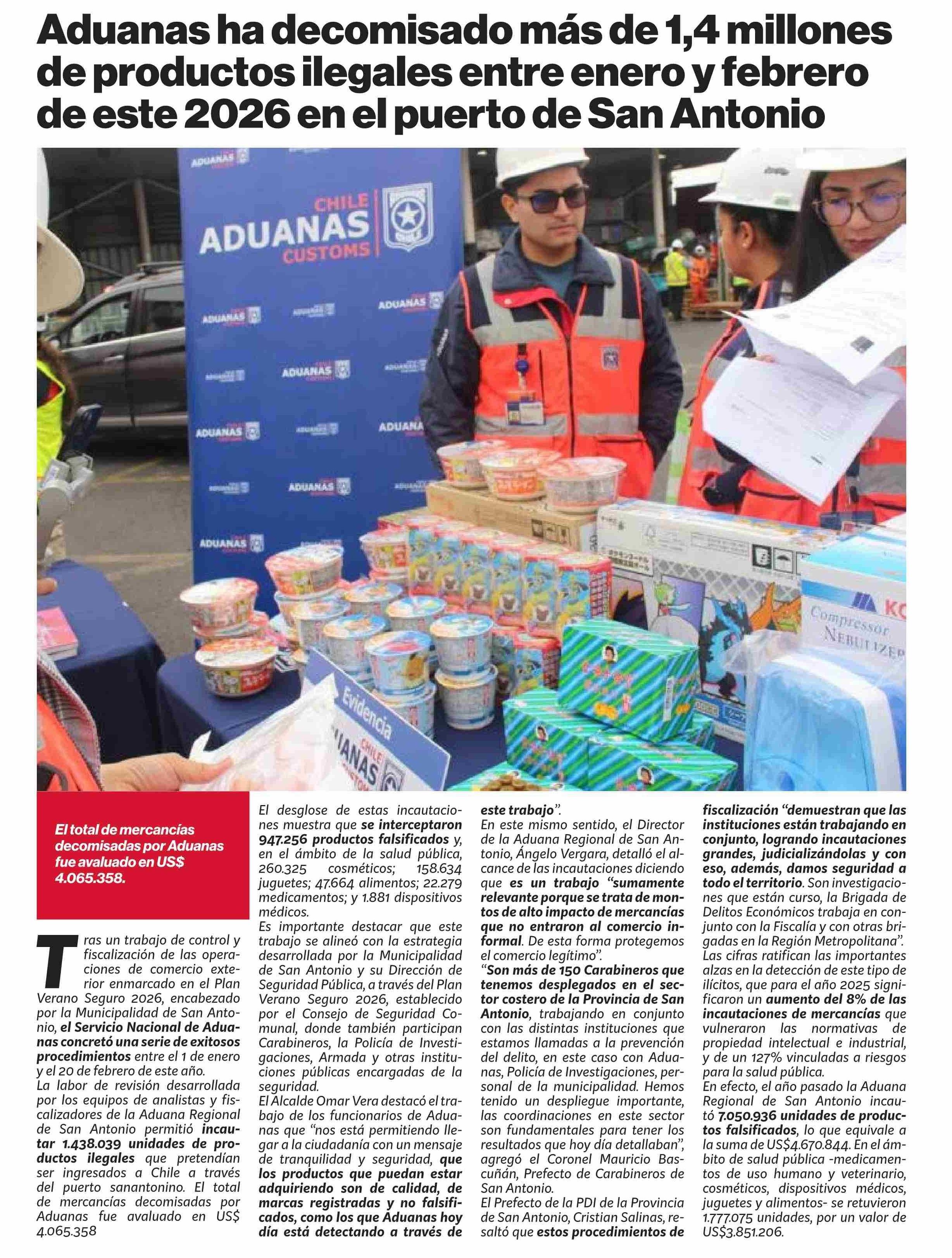 Aduanas ha decomisado más de 1,4 millones de productos ilegales entre enero y febrero de este 2026 en el puerto de San Antonio