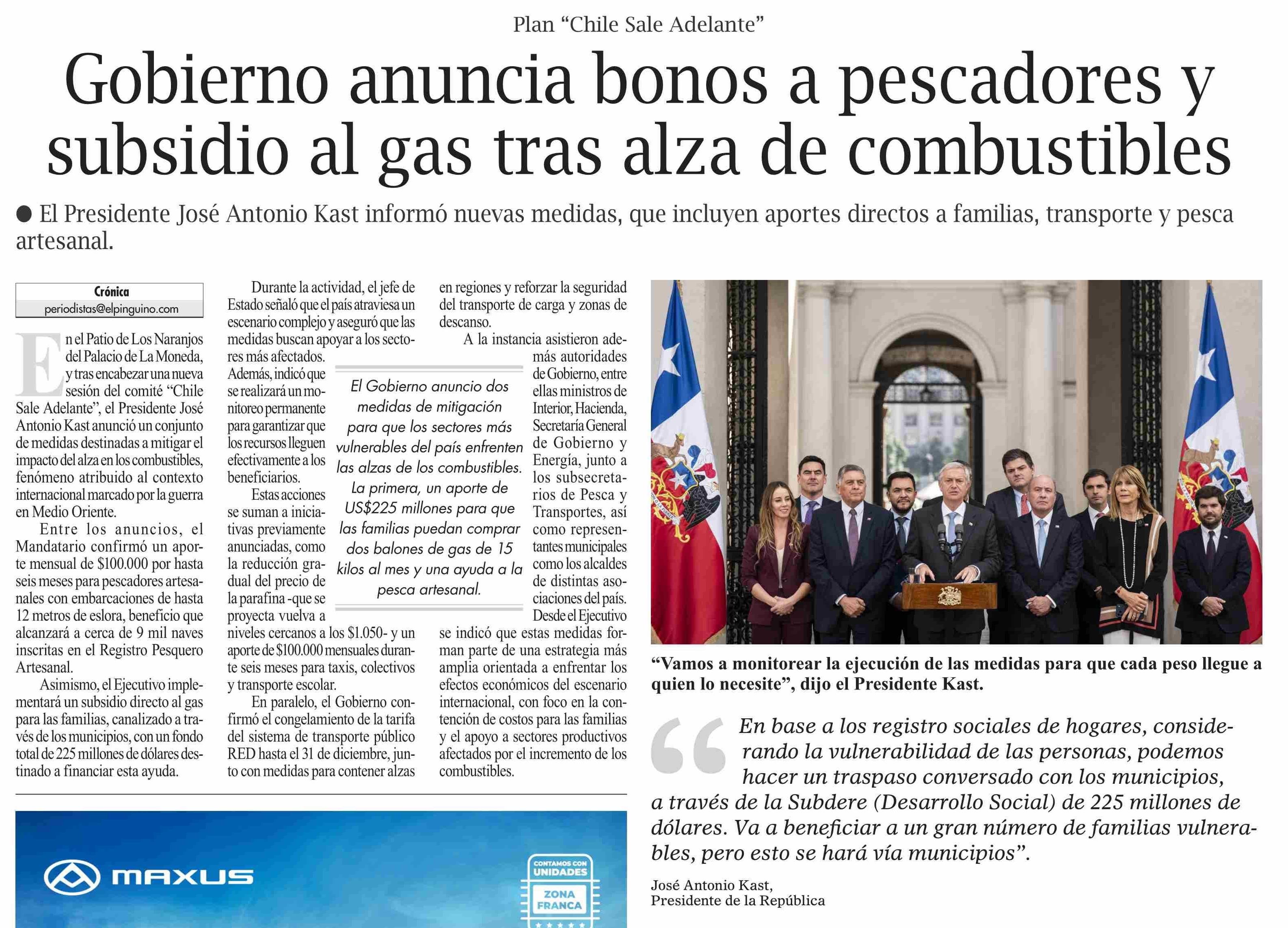 Título: Gobierno anuncia bonos a pescadores y subsidio al gas tras alza de combustibles