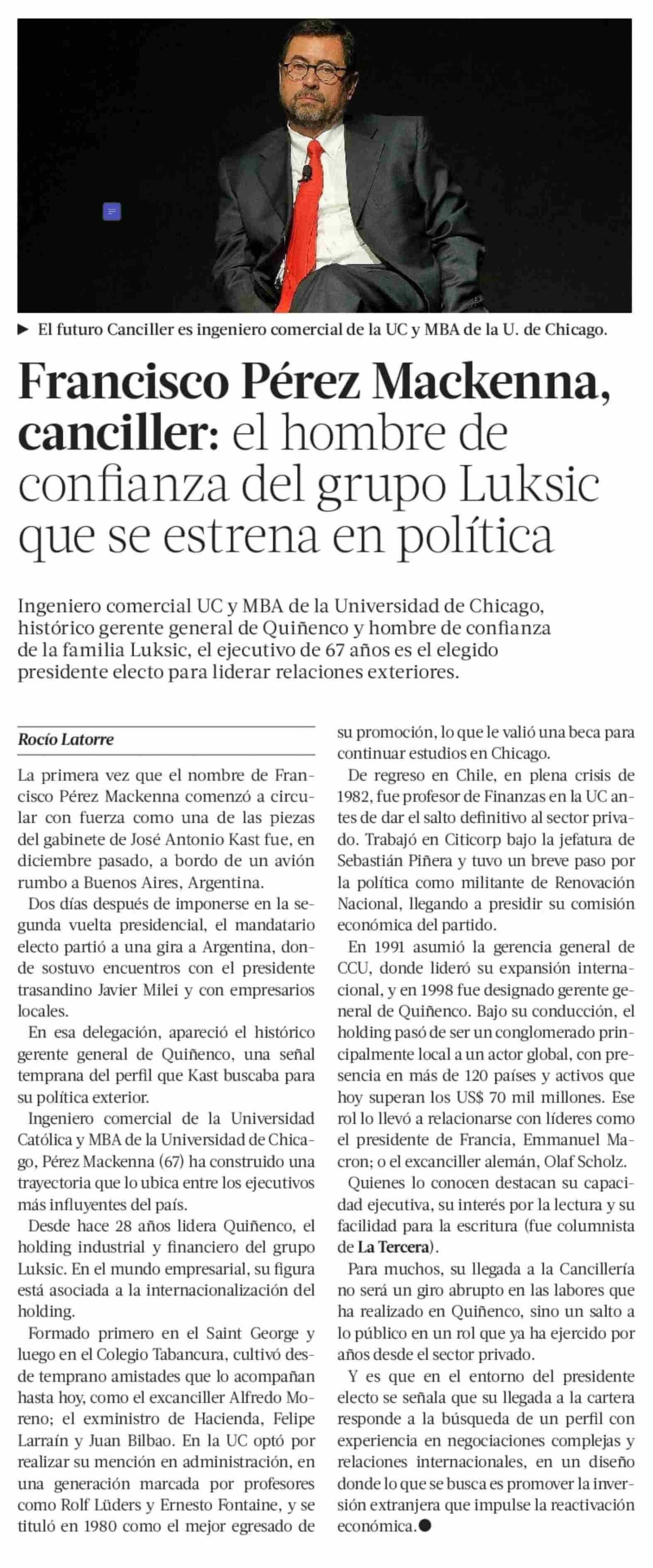 Francisco Pérez Mackenna, canciller: el hombre de confianza del grupo Luksic que se estrena en política