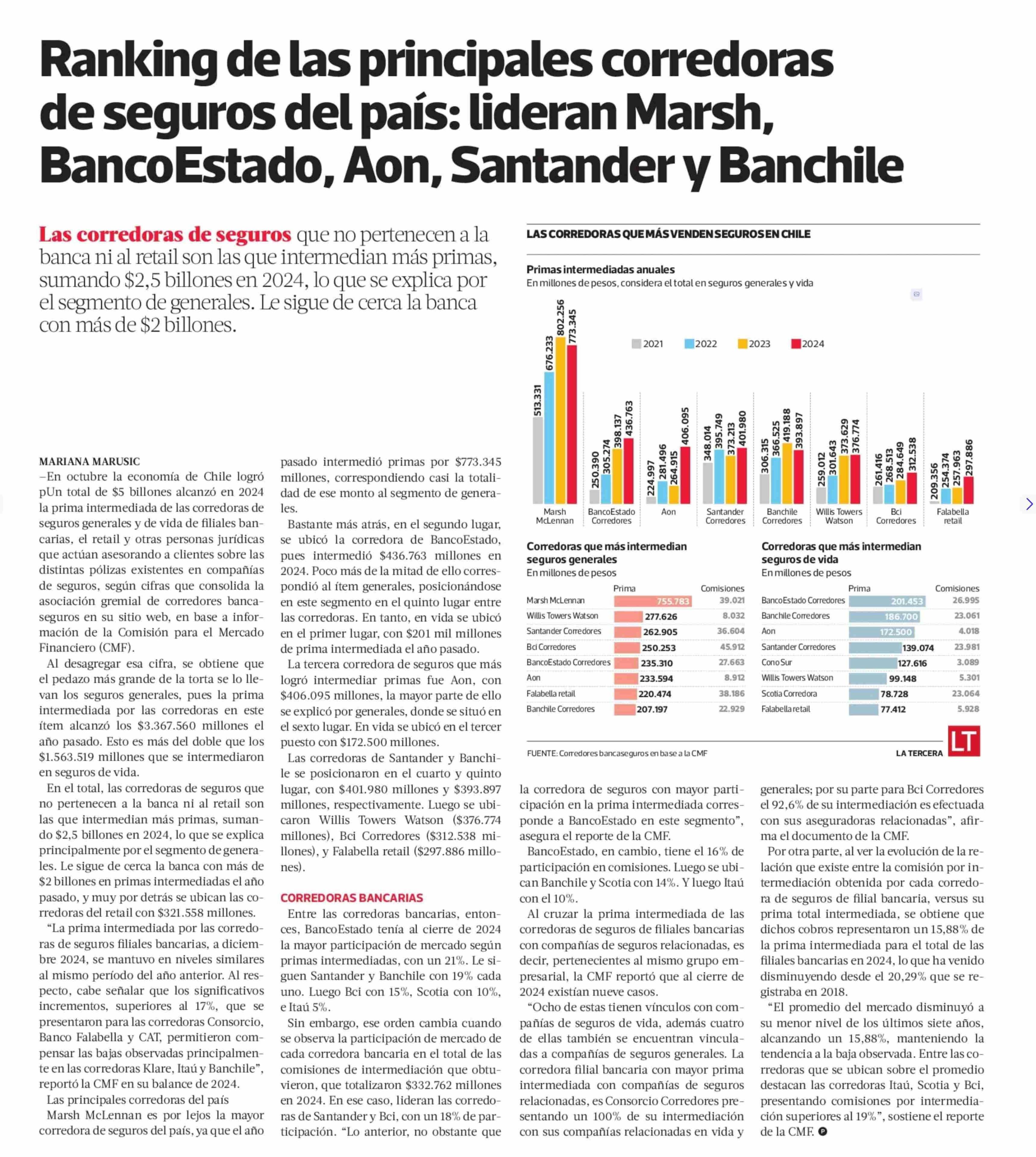 Ranking de las principales corredoras de seguros del país: lideran Marsh, BancoEstado, Aon, Santander y Banchile