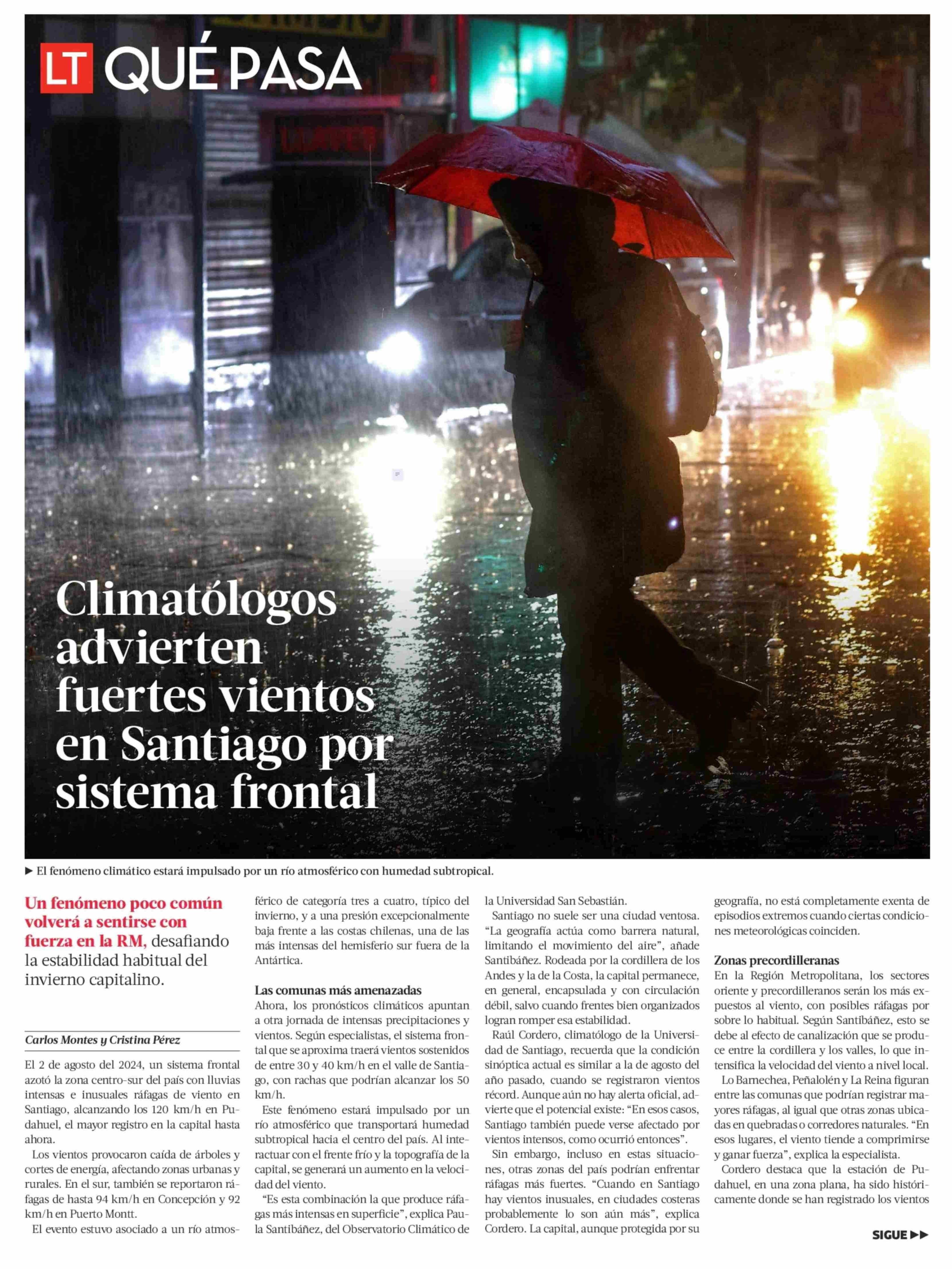 Climatólogos advierten fuertes vientos en Santiago por sistema frontal