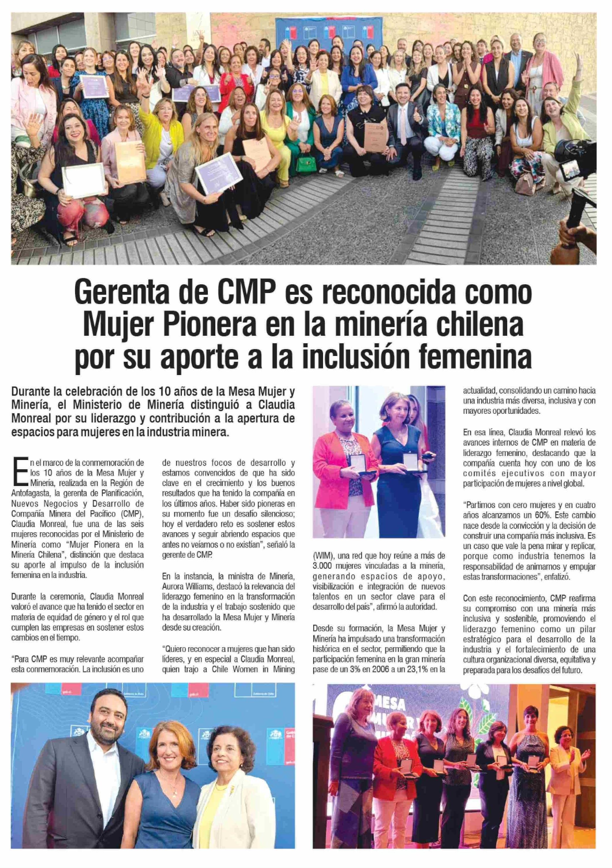Gerenta de CMP es reconocida como Mujer Pionera en la minería chilena por su aporte a la inclusión femenina