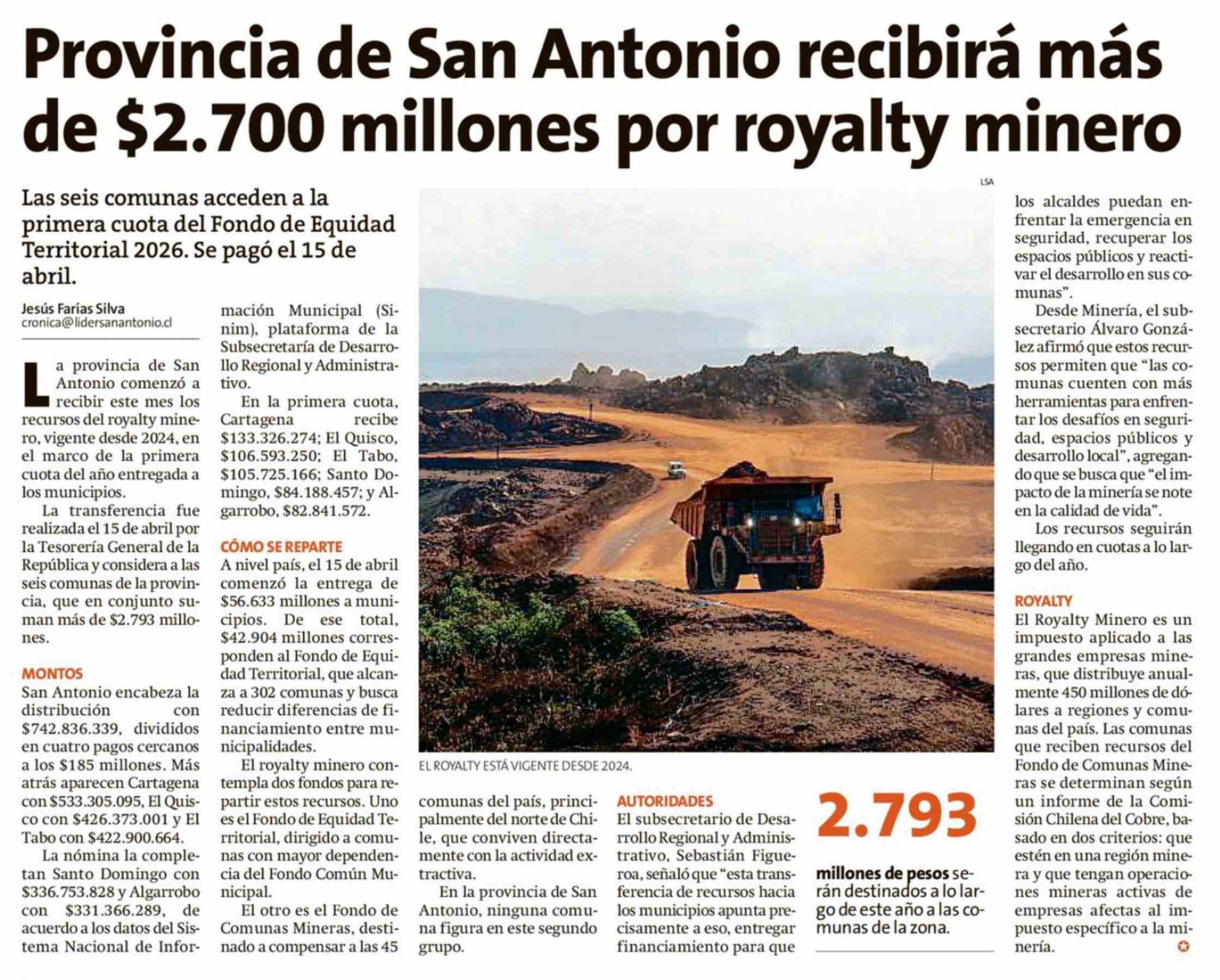 Provincia de San Antonio recibirá más de $2.700 millones por royalty minero