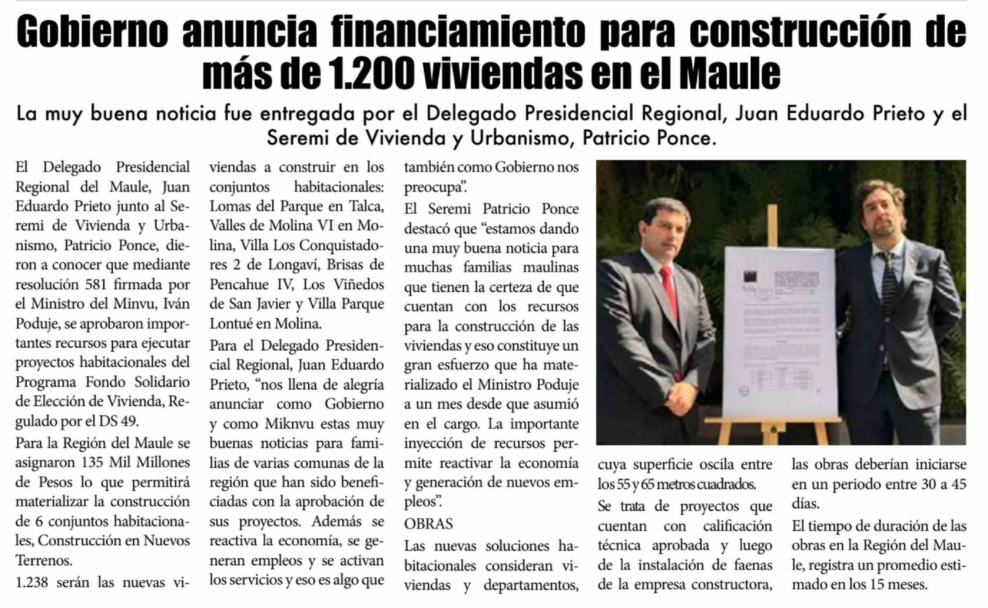 Gobierno anuncia financiamiento para construcción de más de 1.200 viviendas en el Maule