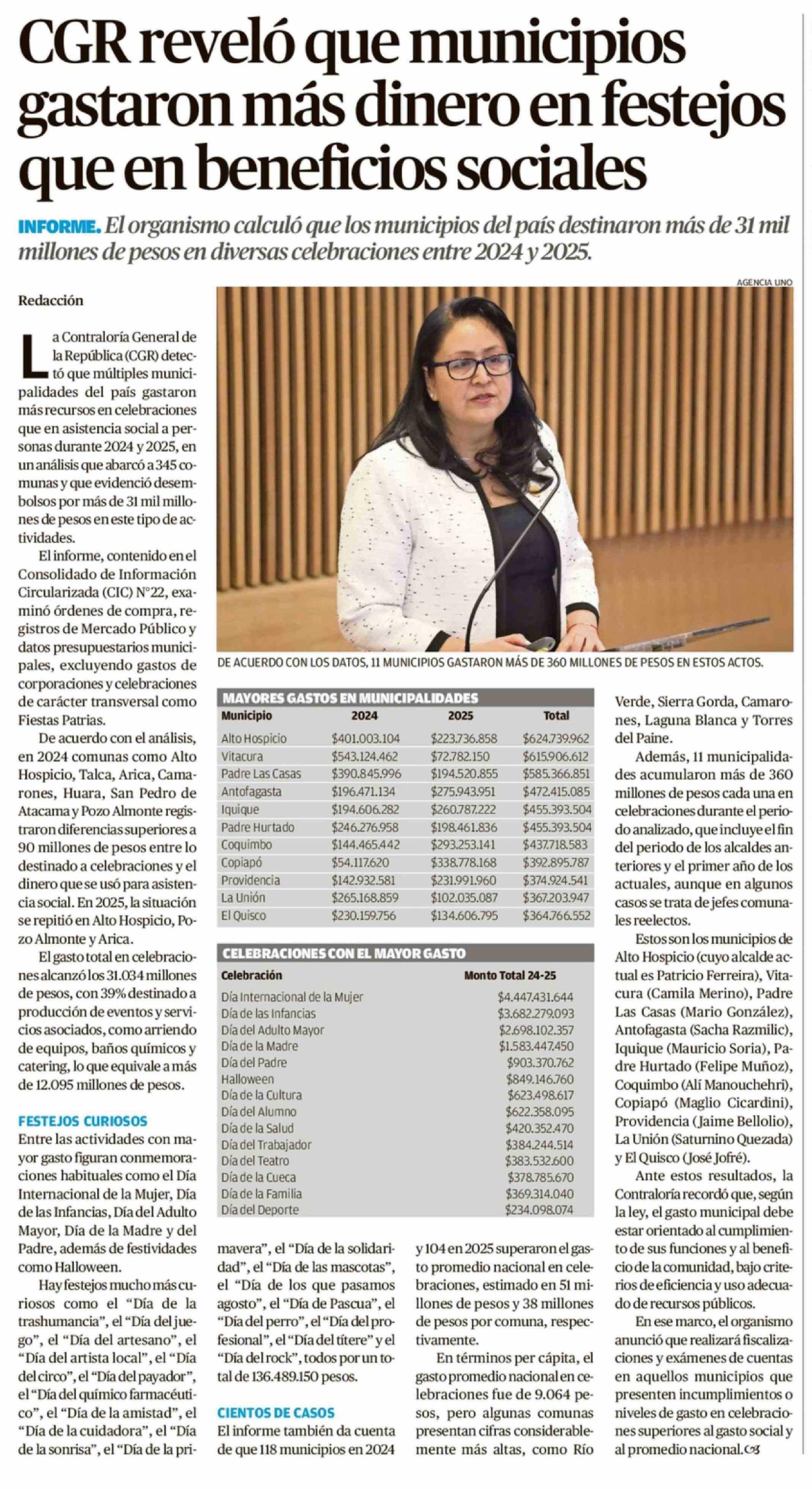 CGR reveló que municipios gastaron más dinero en festejos que en beneficios sociales