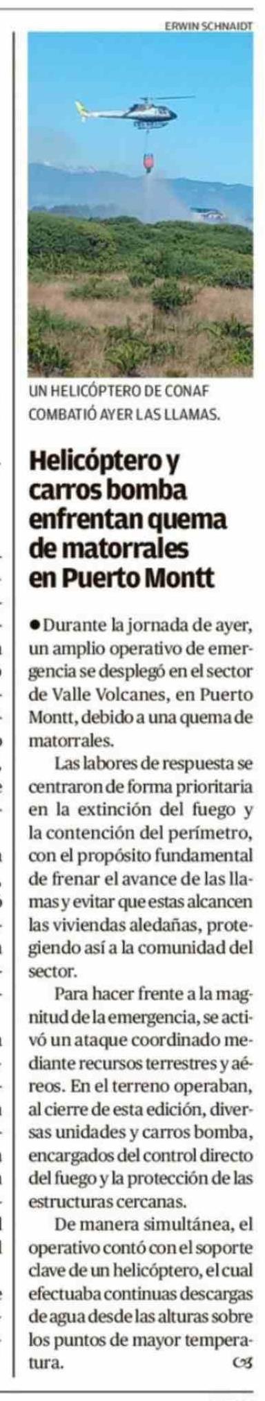 Helicóptero y carros bomba enfrentan quema de matorrales en Puerto Montt