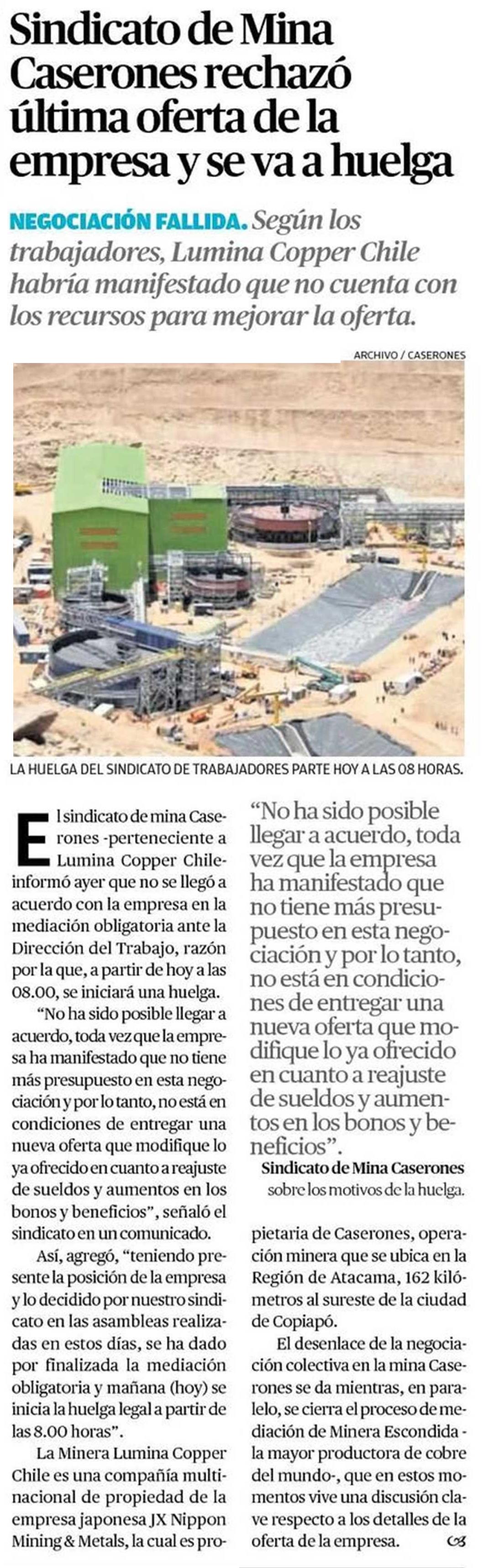 Sindicato de Mina Caserones rechazó última oferta de la empresa y se va a huelga