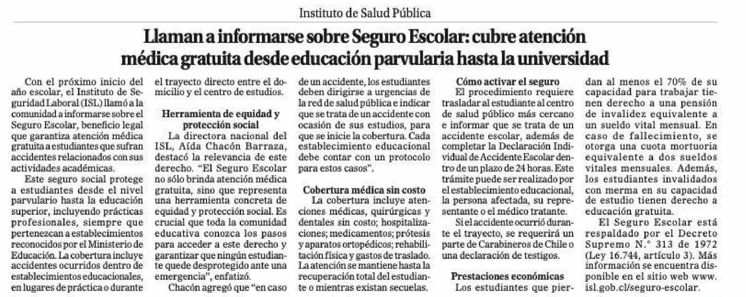 Título: Llaman a infonnarse sobre Seguro Escolan cubre atención médica gratuita desde educación parvularia hasta la universidad