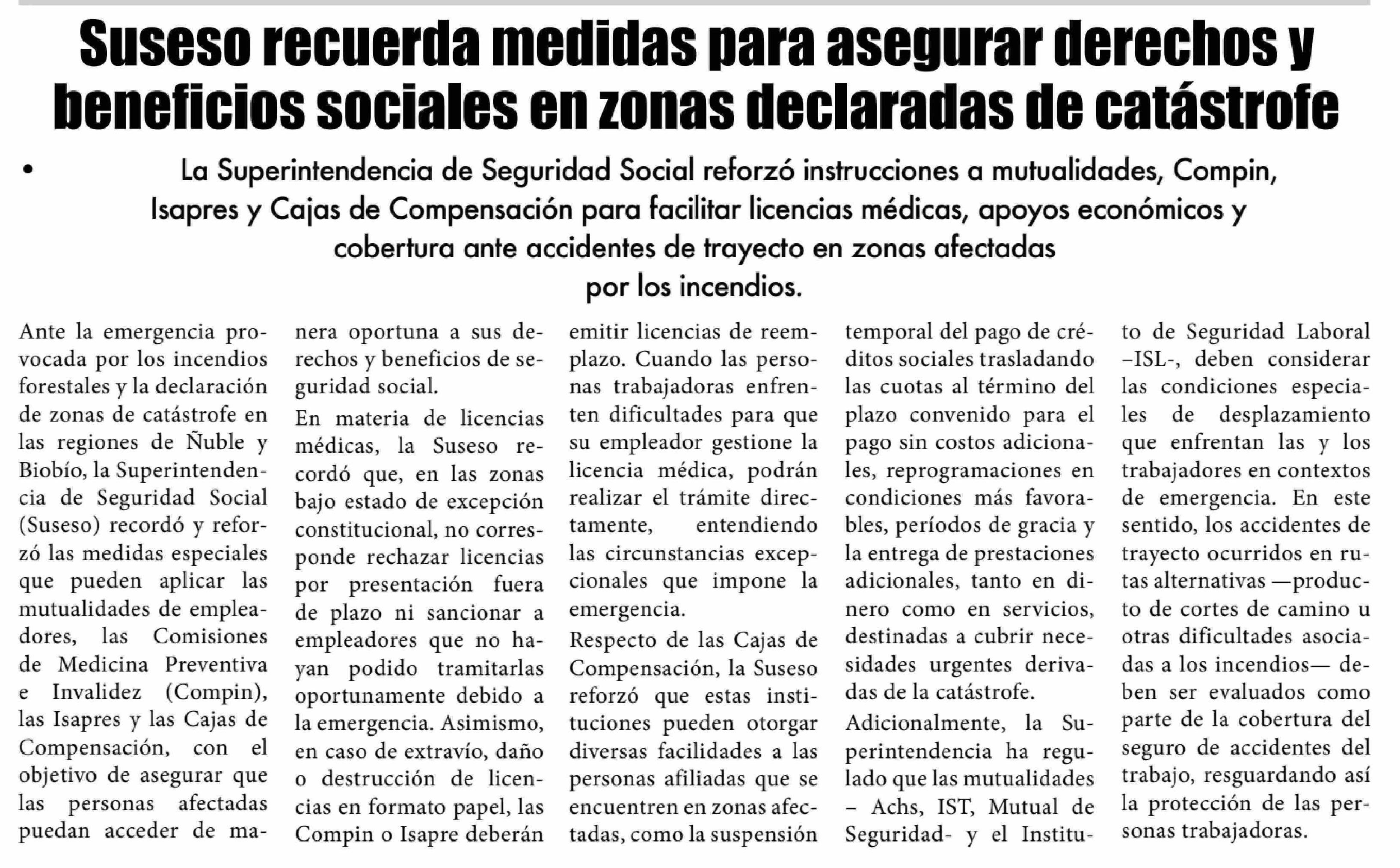 Suseso recuerda medidas para asegurar derechos y beneficios sociales en zonas declaradas de catástrofe