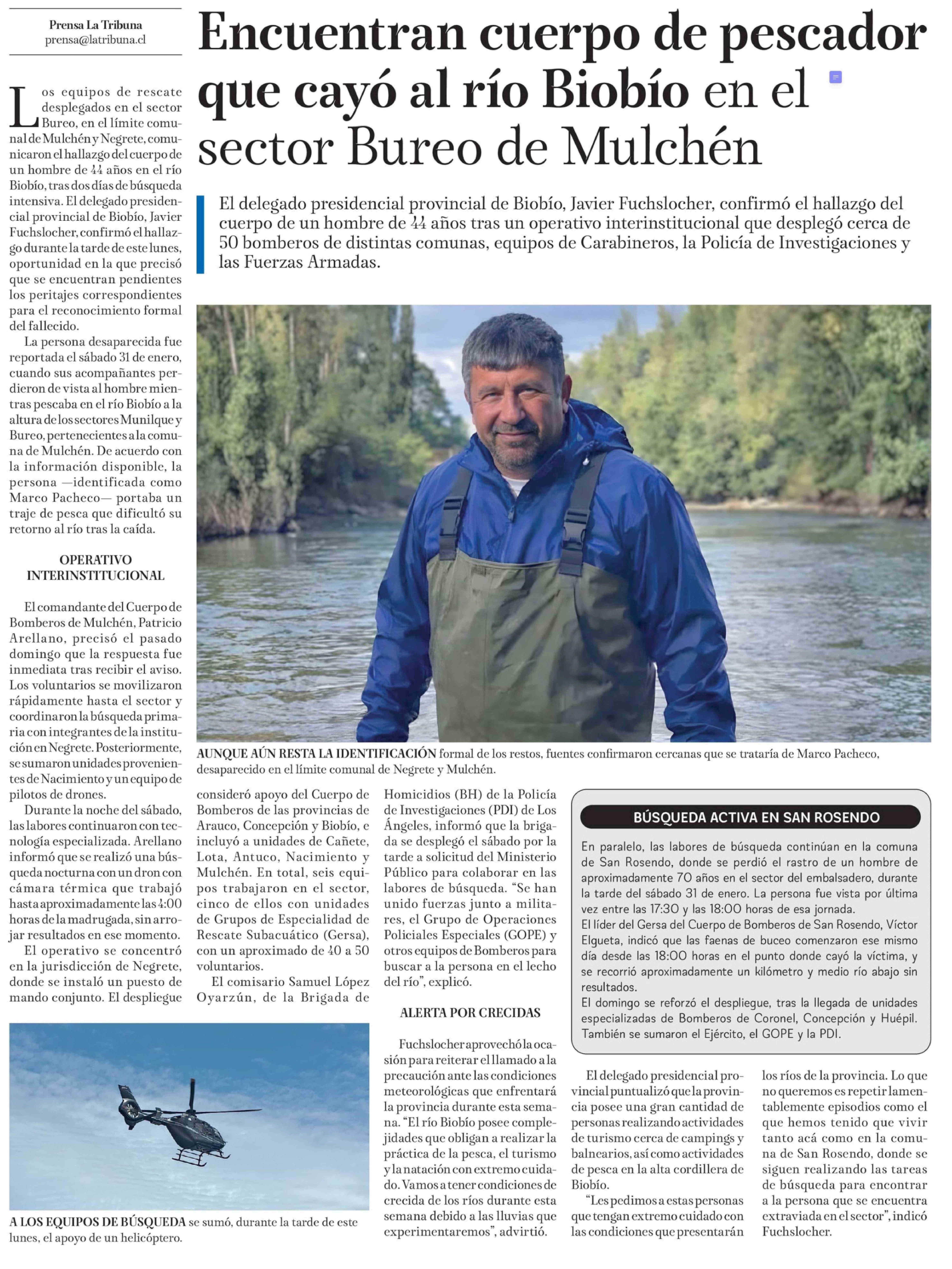 Encuentran cuerpo de pescador que cayó al río Biobío en el sector Bureo de Mulchén
