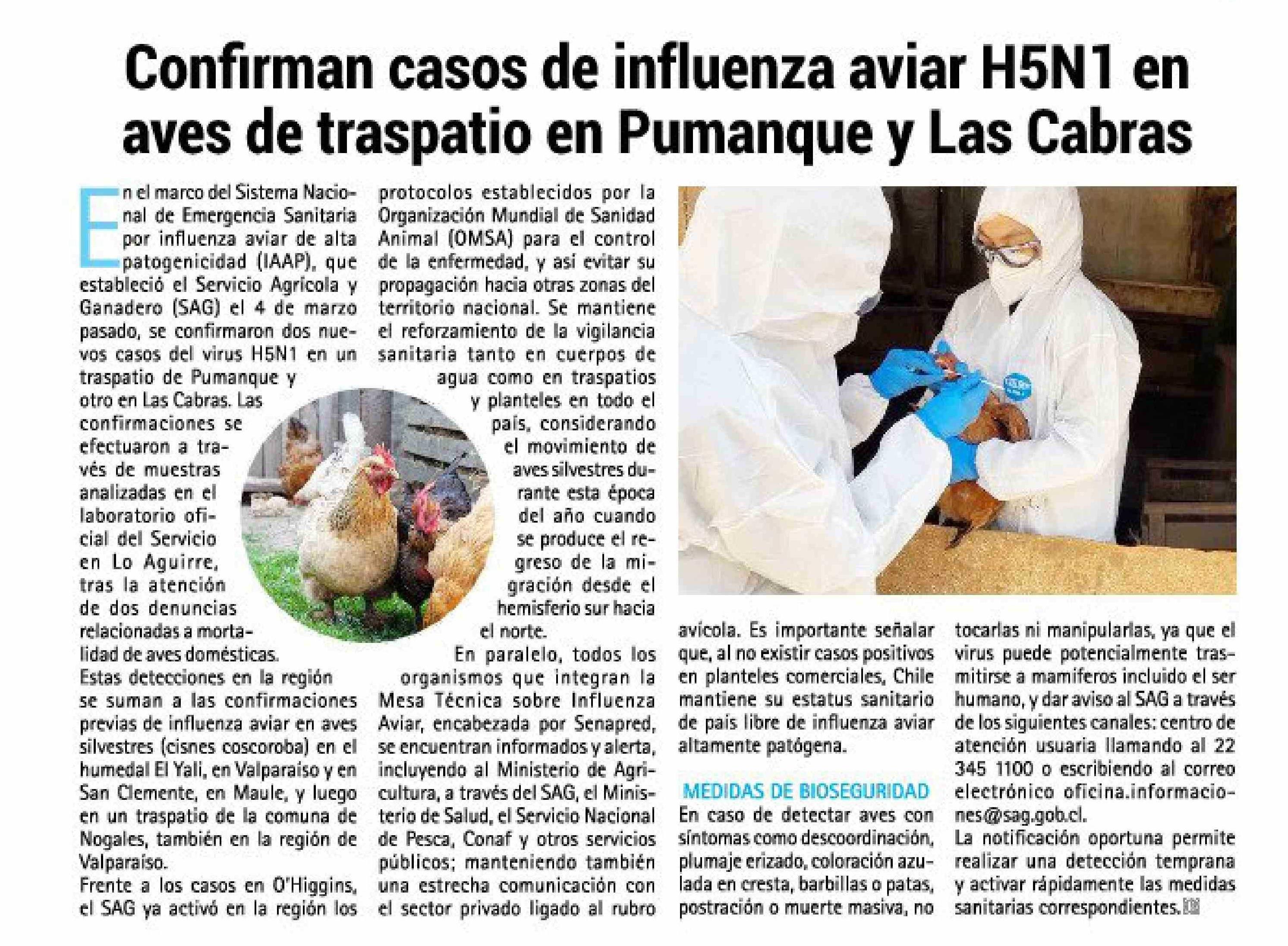 Confirman casos de influenza aviar H5N1 en aves de traspatio en Pumanque y Las Cabras