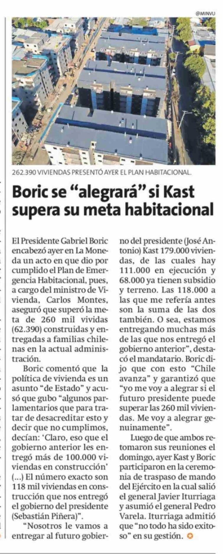 Boric se "alegrará" si Kast supera su meta habitacional