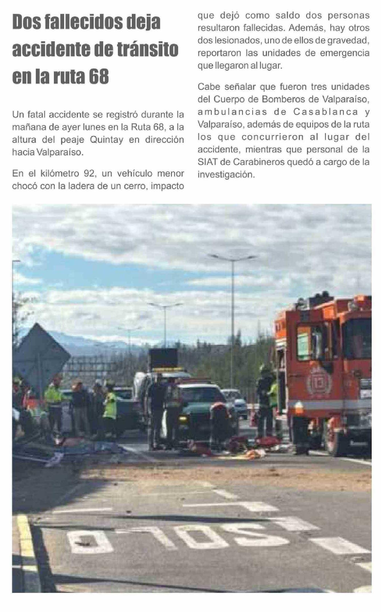 Dos fallecidos deja accidente de tránsito en la ruta 68