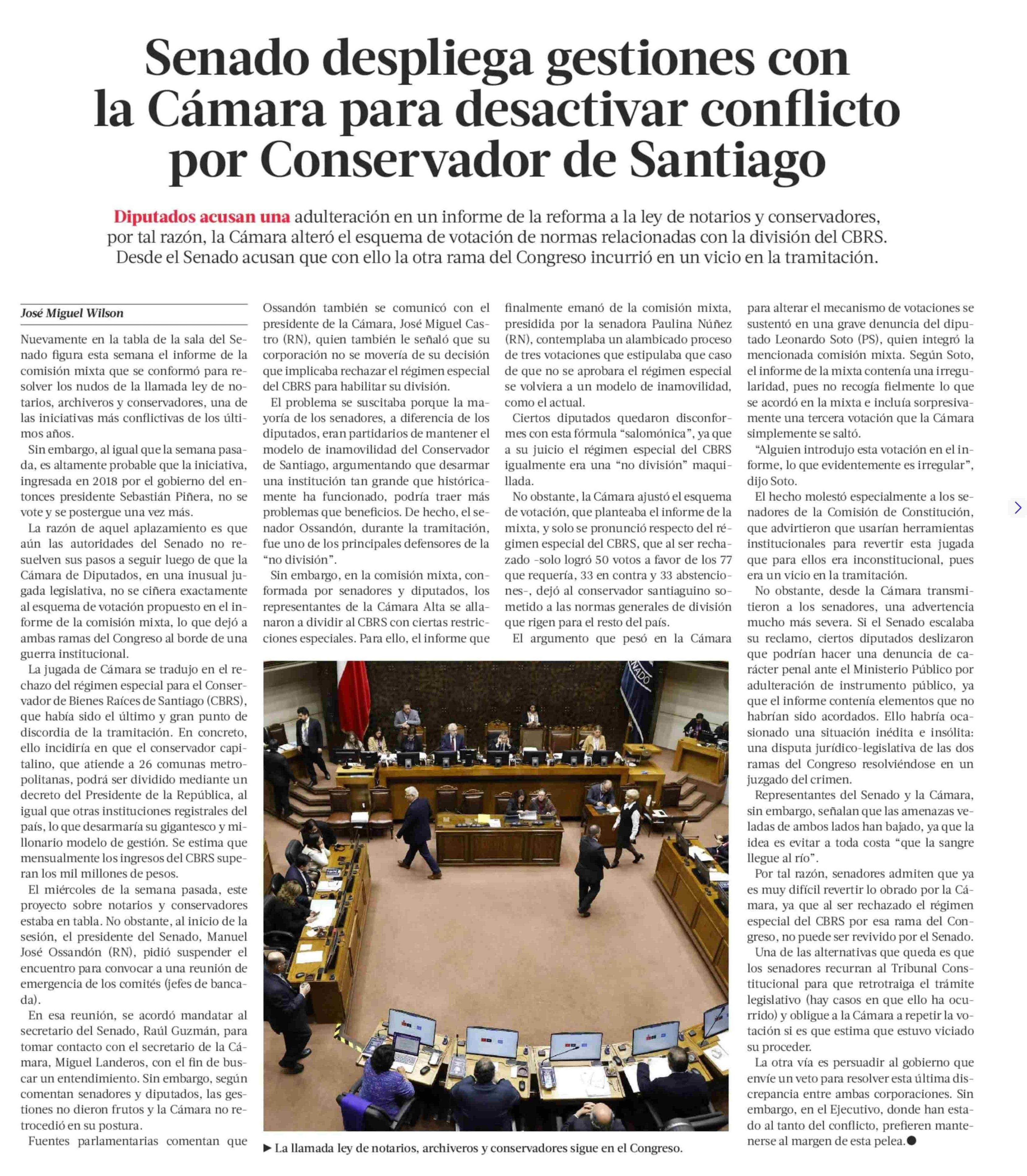Senado despliega gestiones con la Cámara para desactivar conflicto por Conservador de Santiago