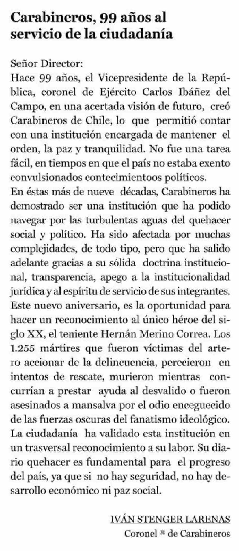 Cartas: Carabineros, 99 años al servicio de la ciudadanía