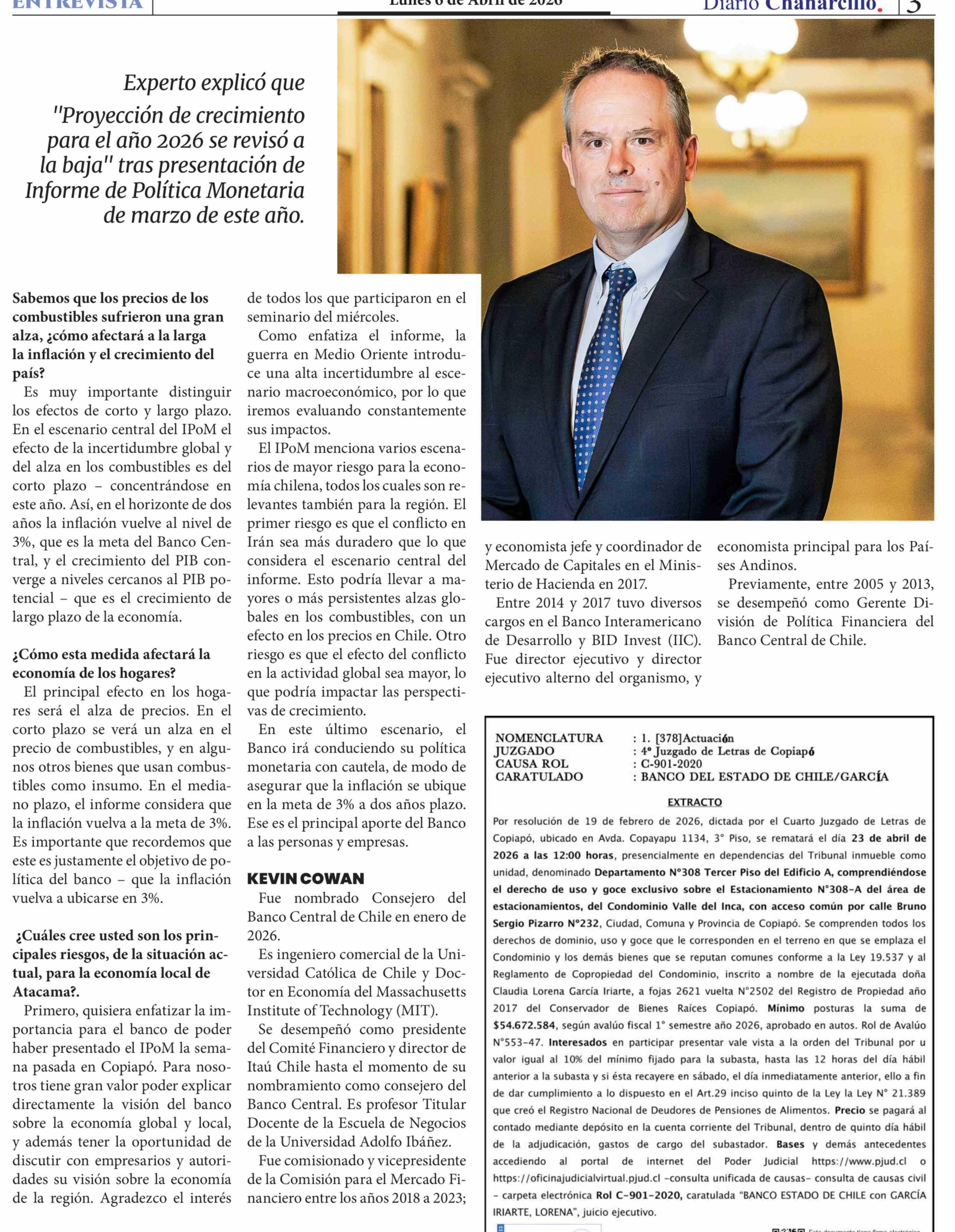 Aseguró el consejero del Banco Central, Kevin Cowan: "El principal efecto en los hogares será el alza de precios"