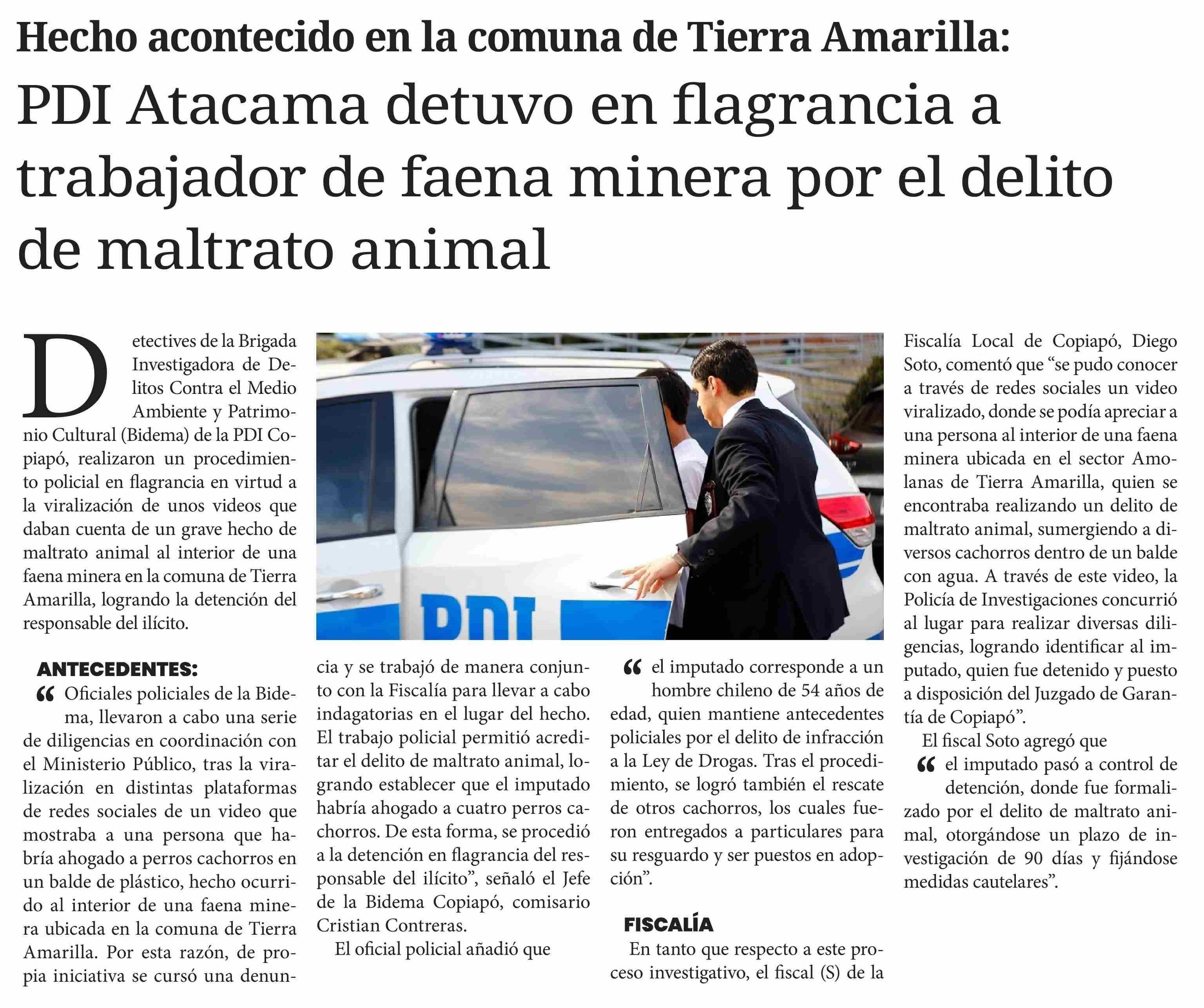 PDI Atacama detuvo en flagrancia a trabajador de faena minera por el delito de maltrato animal
