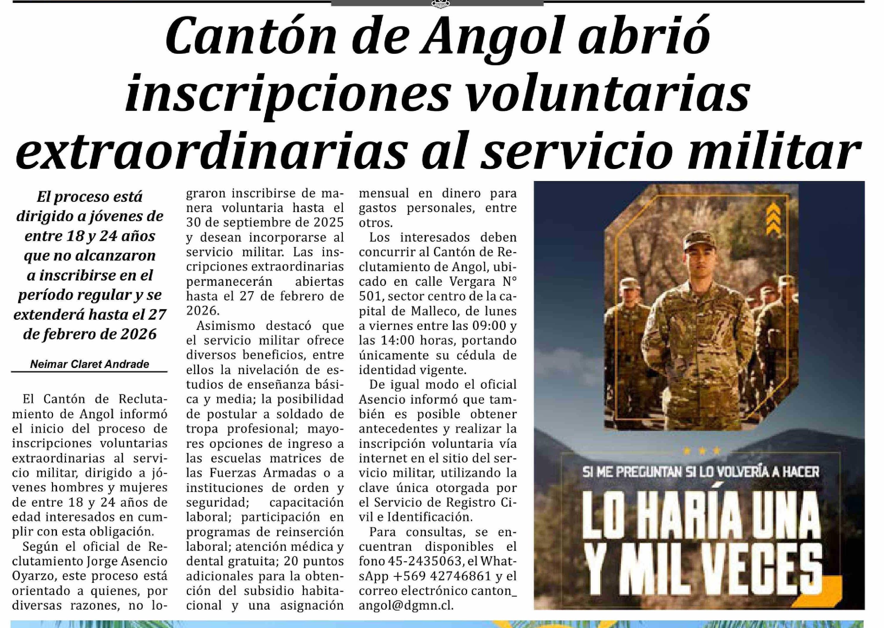 Cantón de Angol abrió inscripciones voluntarias extraordinarias al servicio militar