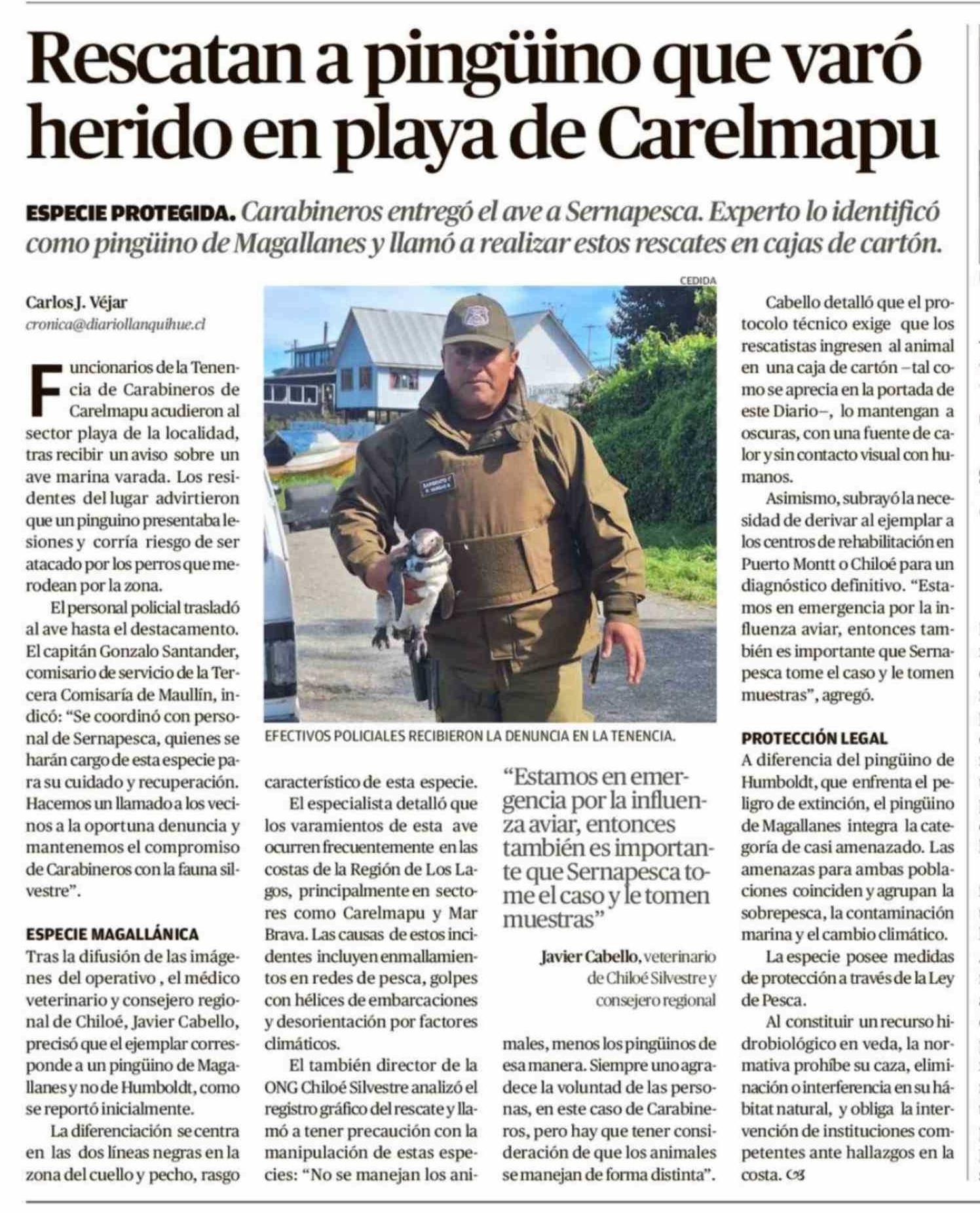 Rescatan a pingüino que varó herido en playa de Carelmapu