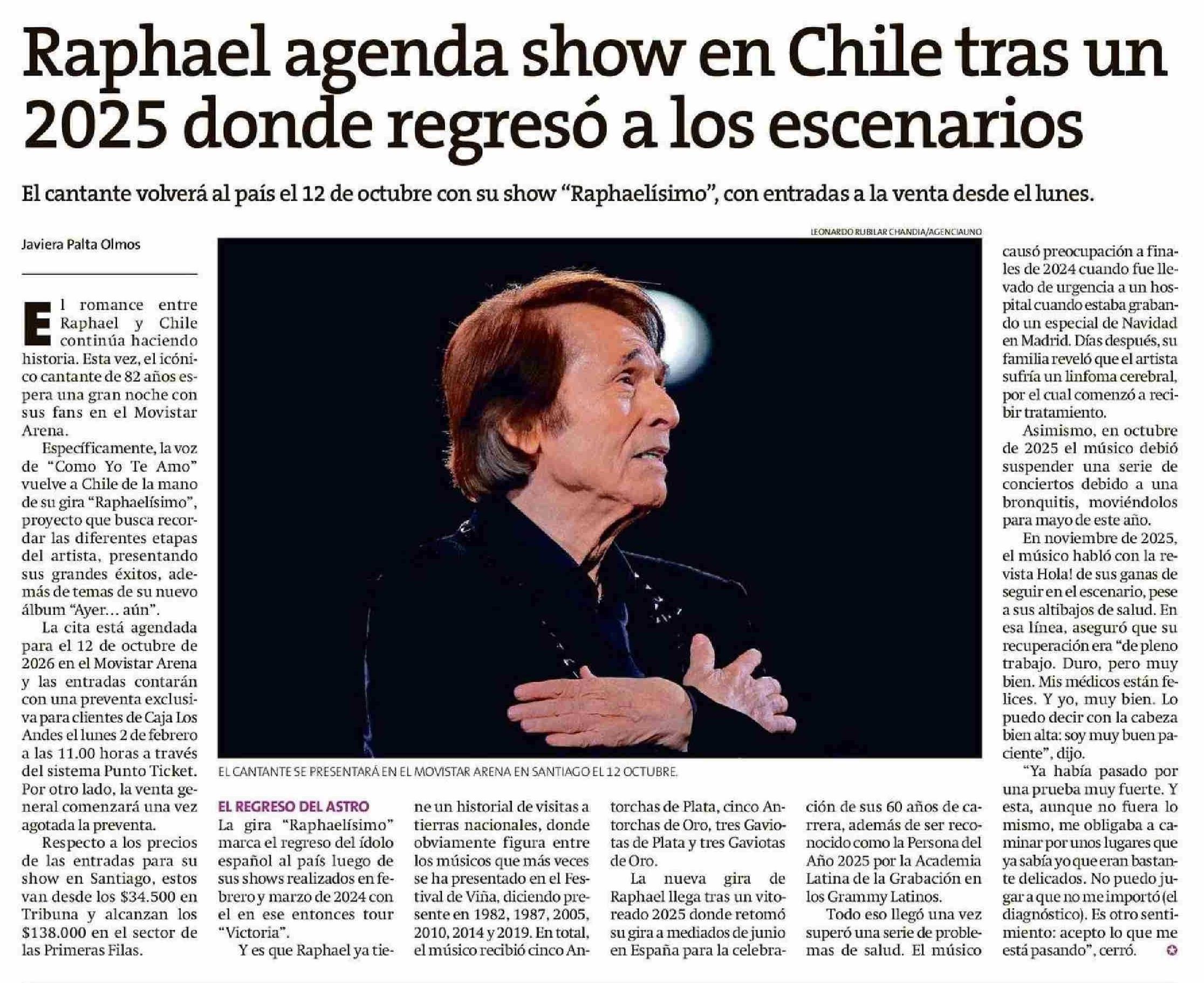 Raphael agenda show en Chile tras un 2025 donde regresó a los escenarios