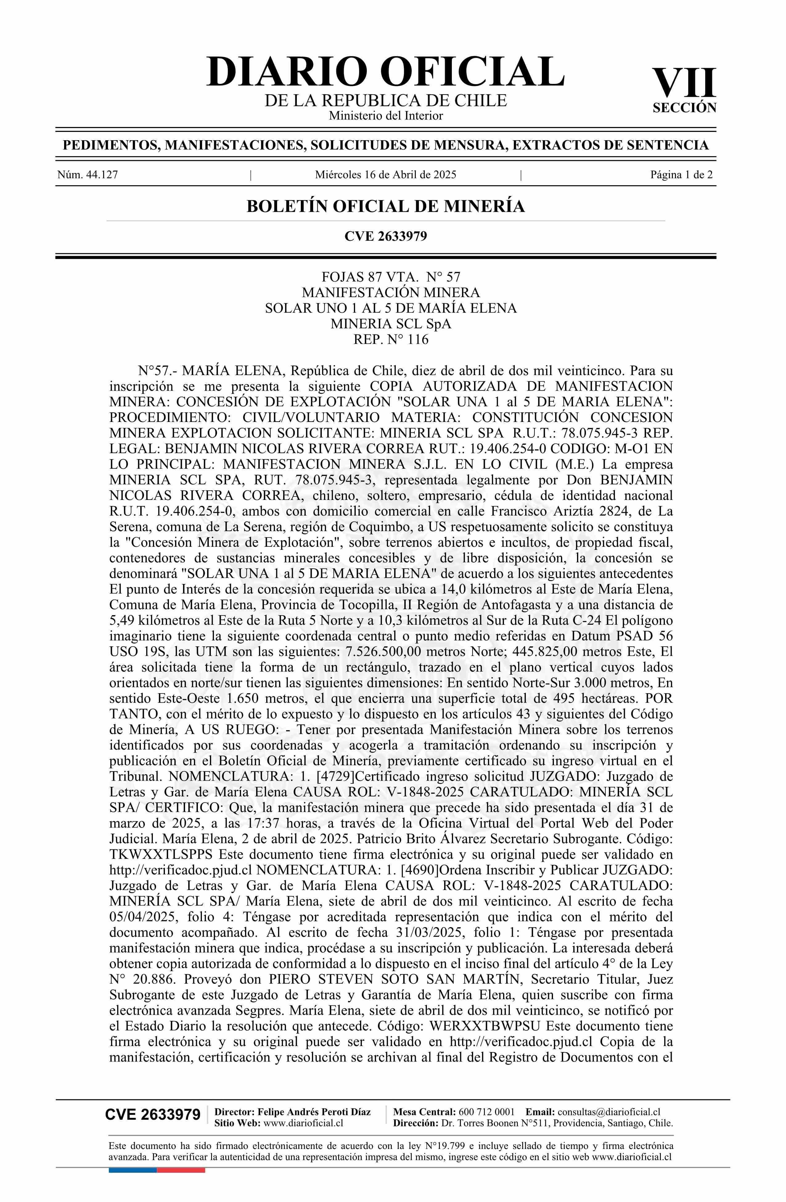 SOLAR UNA 1 al 5 DE MARIA ELENA / Minería SCL SpA