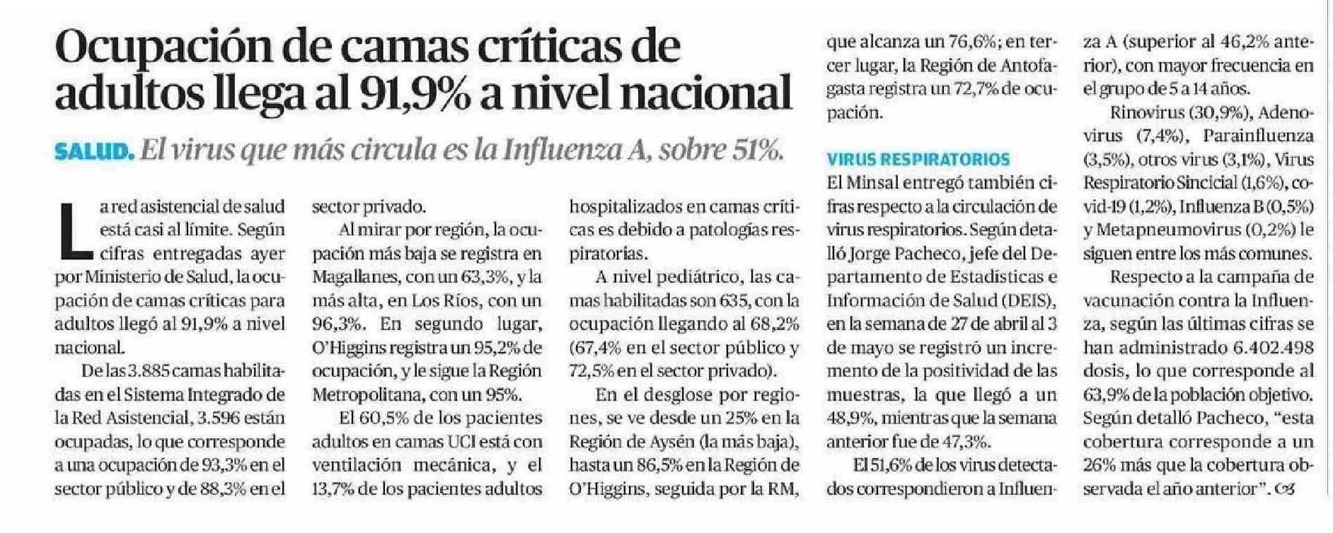 Ocupación de camas críticas de adultos llega al 91,9% a nivel nacional