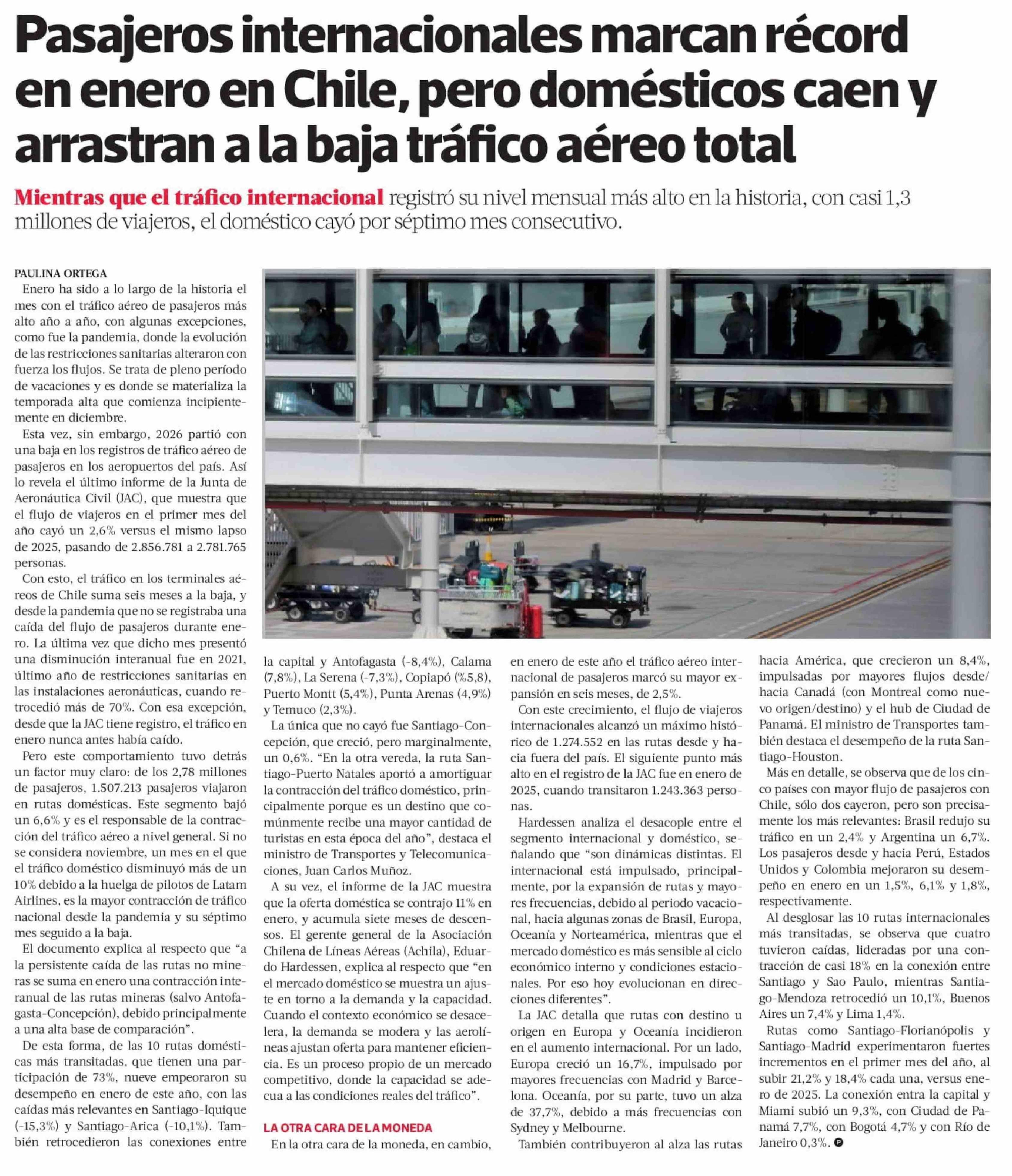 Pasajeros internacionales marcan récord en enero en Chile, pero domésticos caen y arrastran a la baja tráfico aéreo total