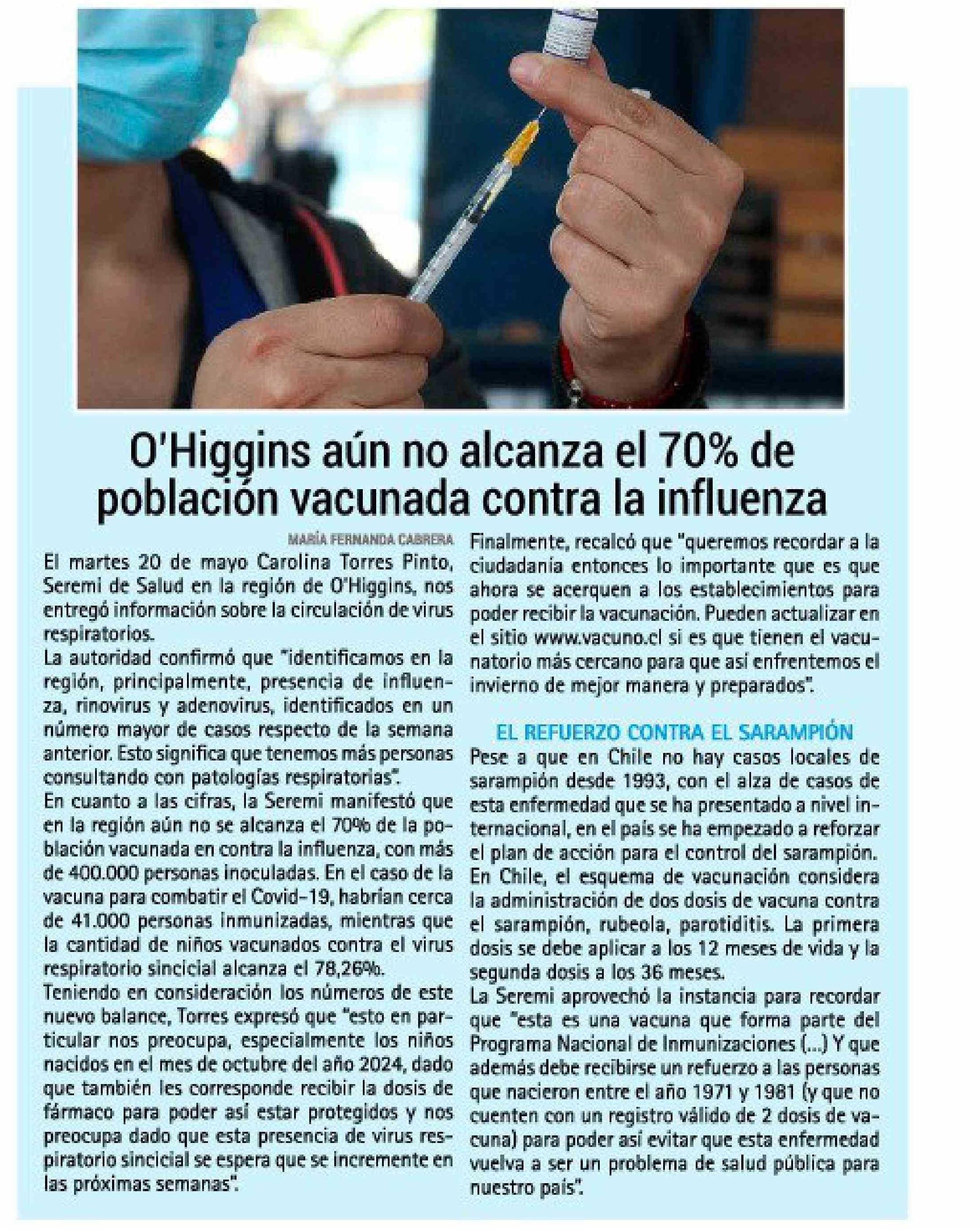 O'Higgins aún no alcanza el 70% de población vacunada contra la influenza