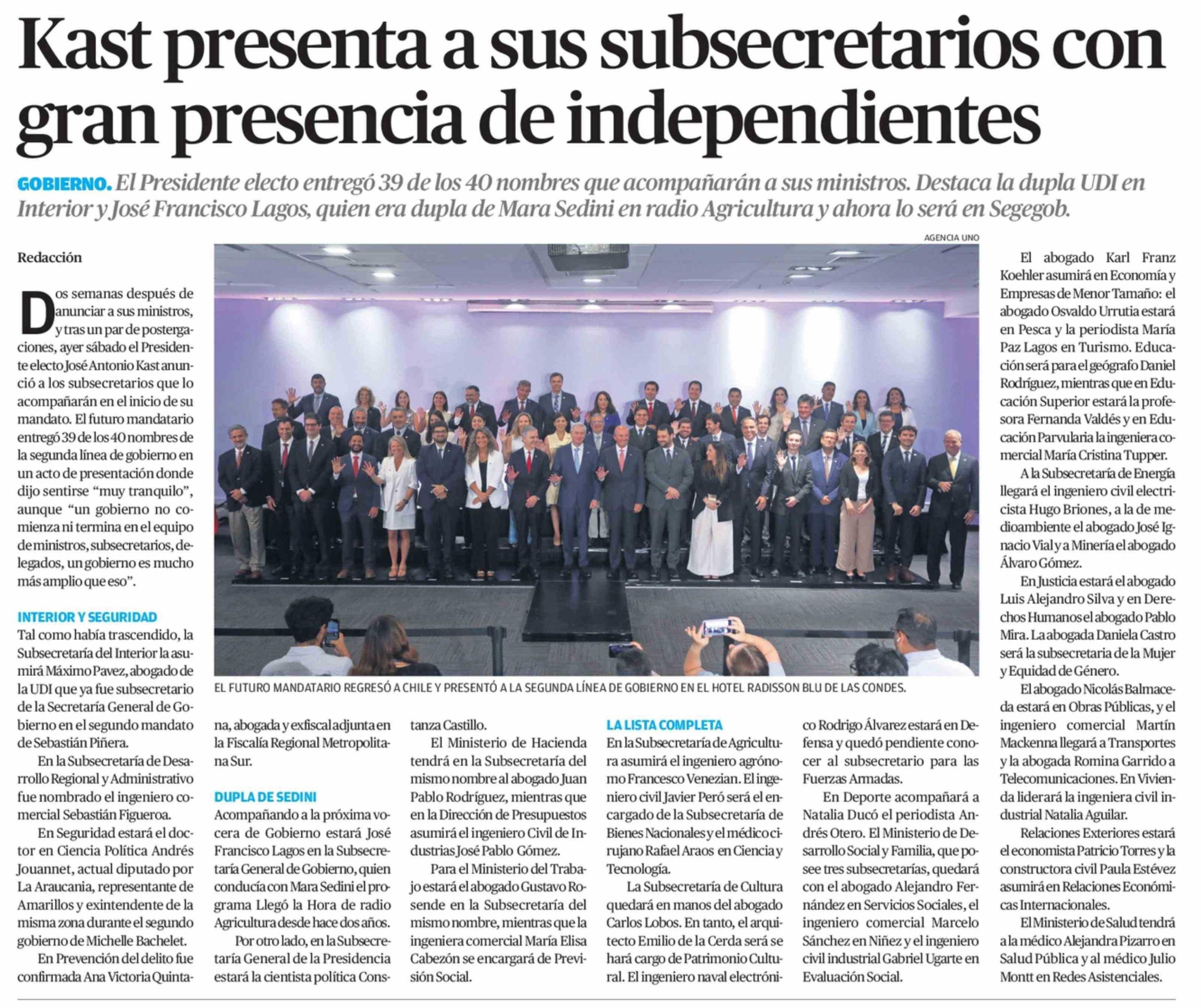 Kast presenta a sus subsecretarios con gran presencia de independientes
