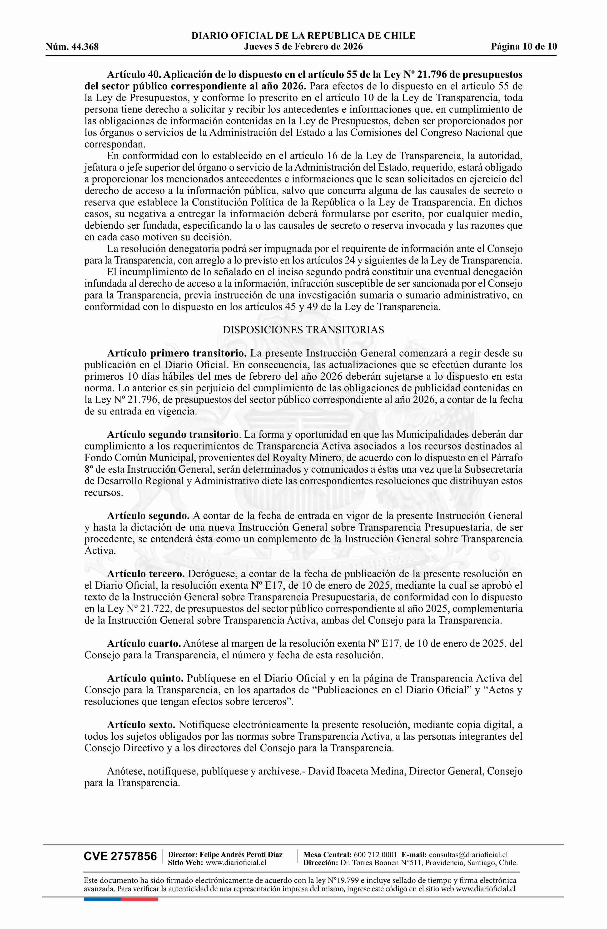 | Título: | Resolución exenta número E39, de 2026.- Aprueba texto de la Instrucción General sobre Transparencia Presupuestaria, de conformidad con lo dispuesto en la Ley Nº 21.796, de Presupuestos del Sector Público correspondiente al año 2026, complementaria de la Instrucción General sobre Transparencia Activa |