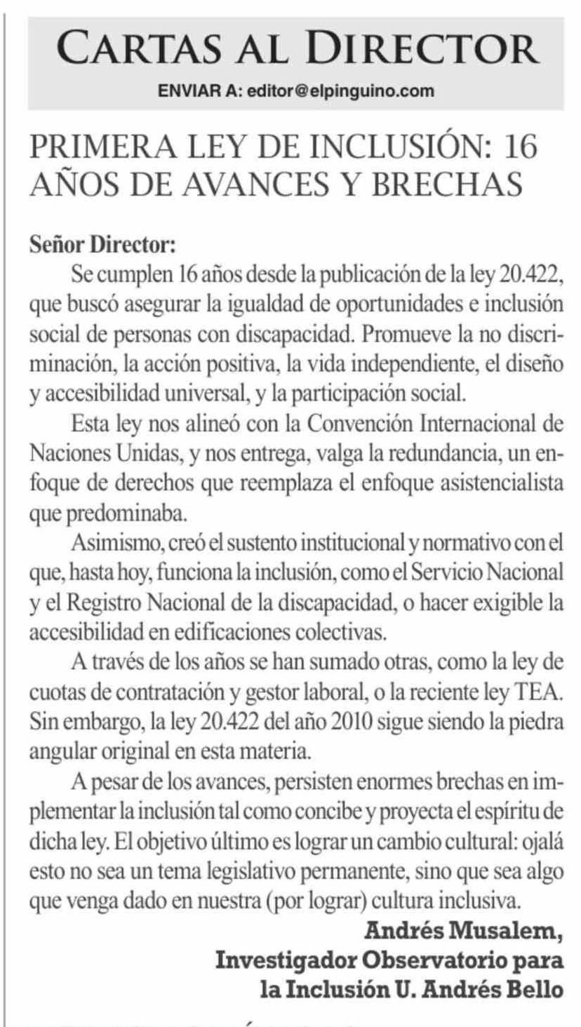 Cartas: PRIMERA LEY DE INCLUSIÓN: 16 AÑOS DE AVANCES Y BRECHAS