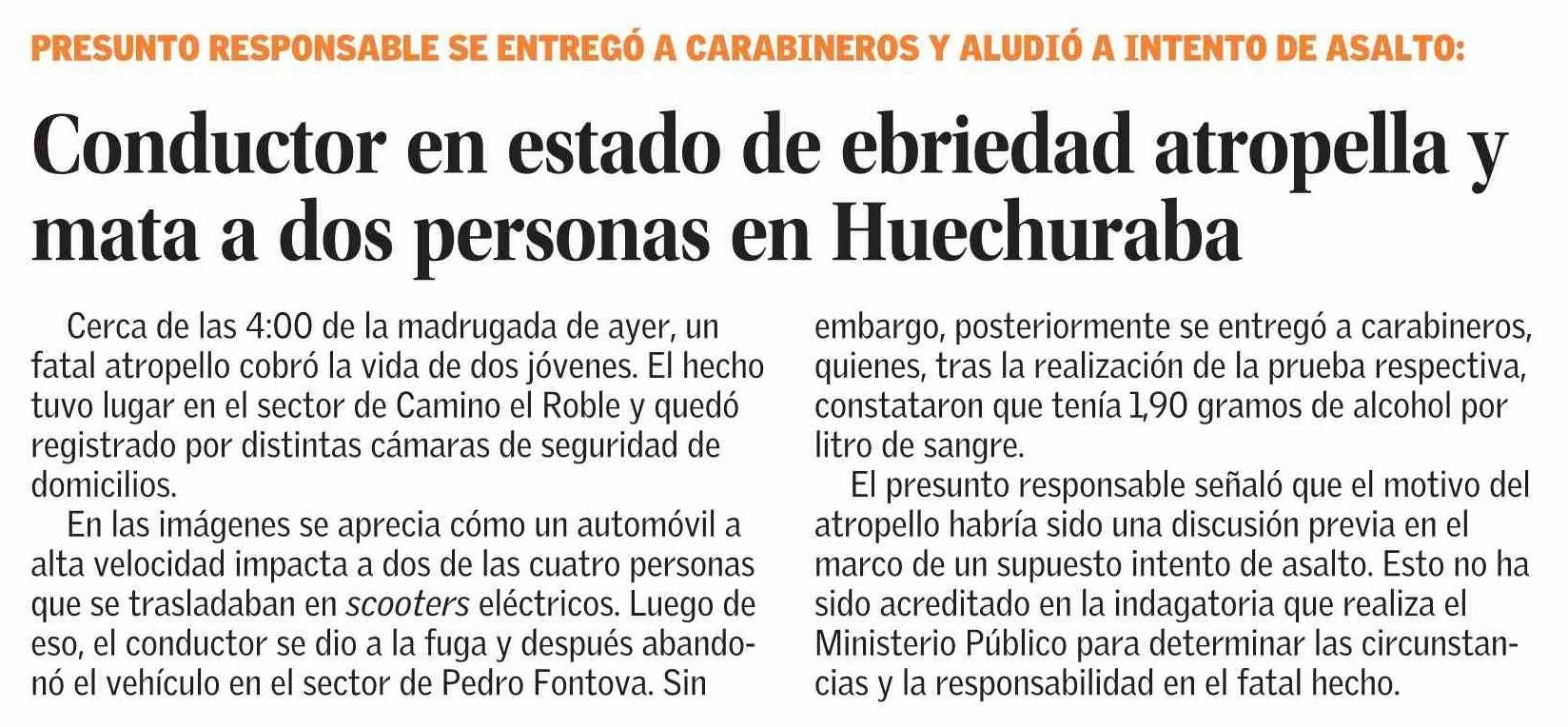 Conductor en estado de ebriedad atropella y mata a dos personas en Huechuraba