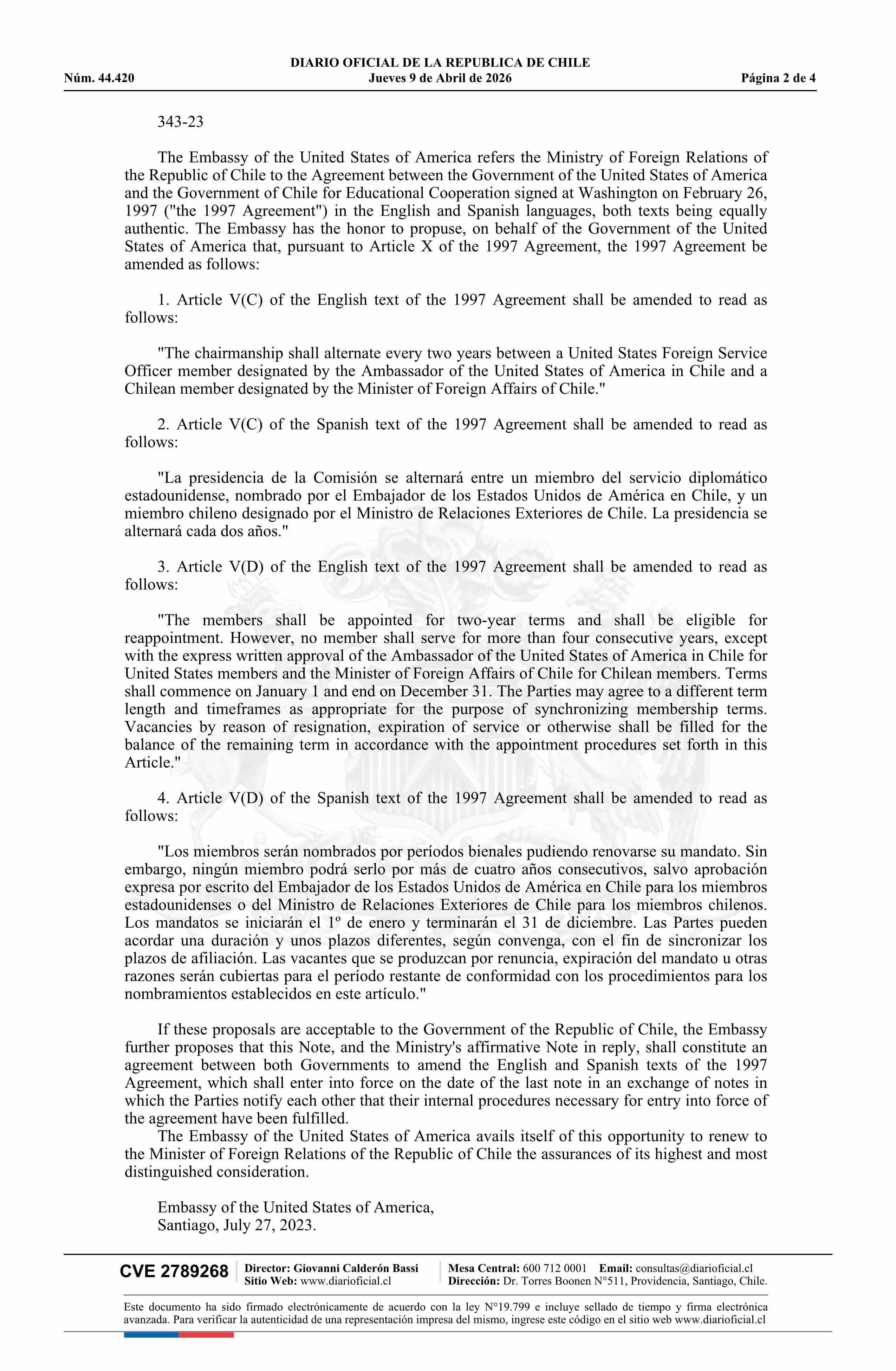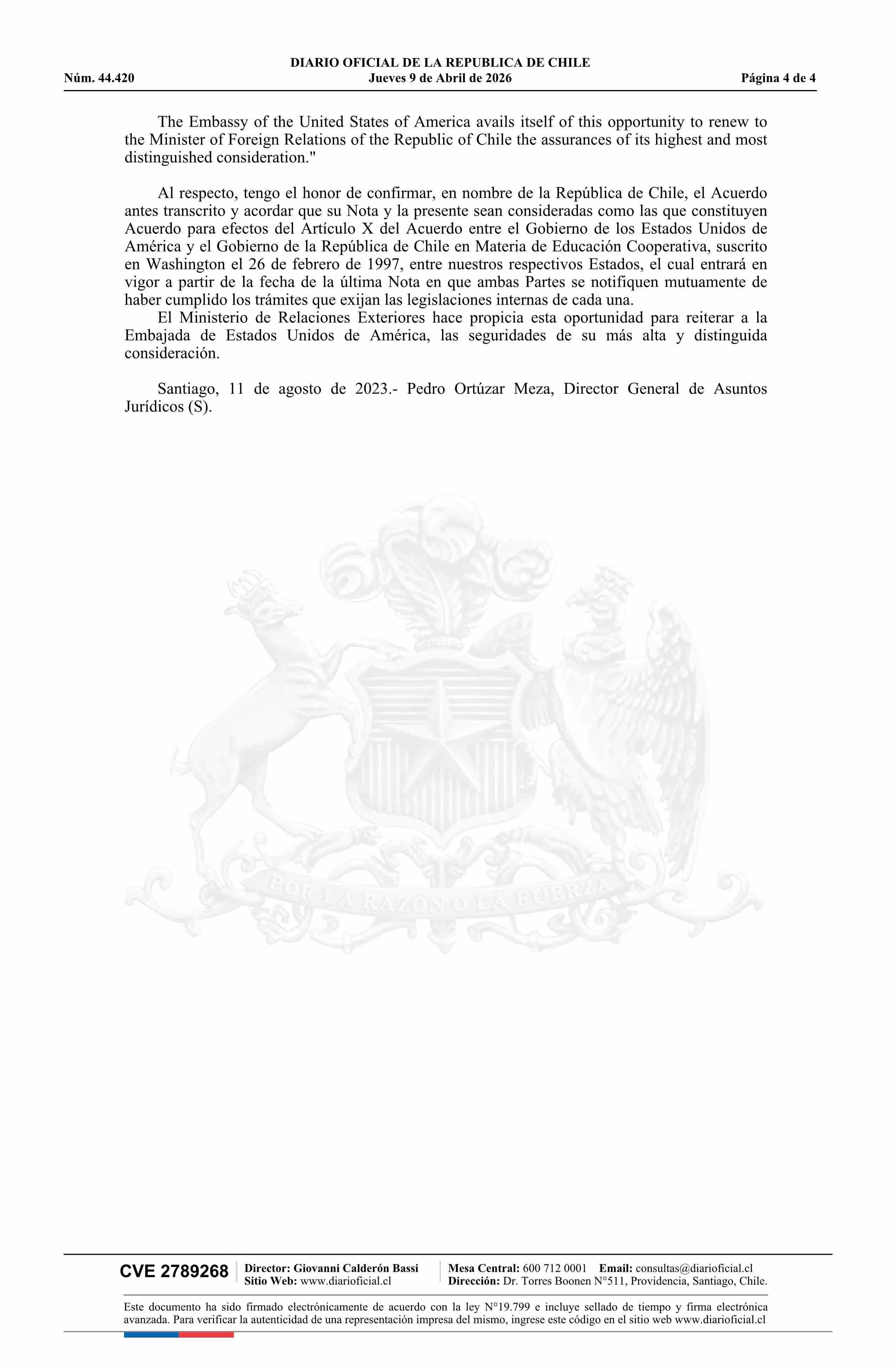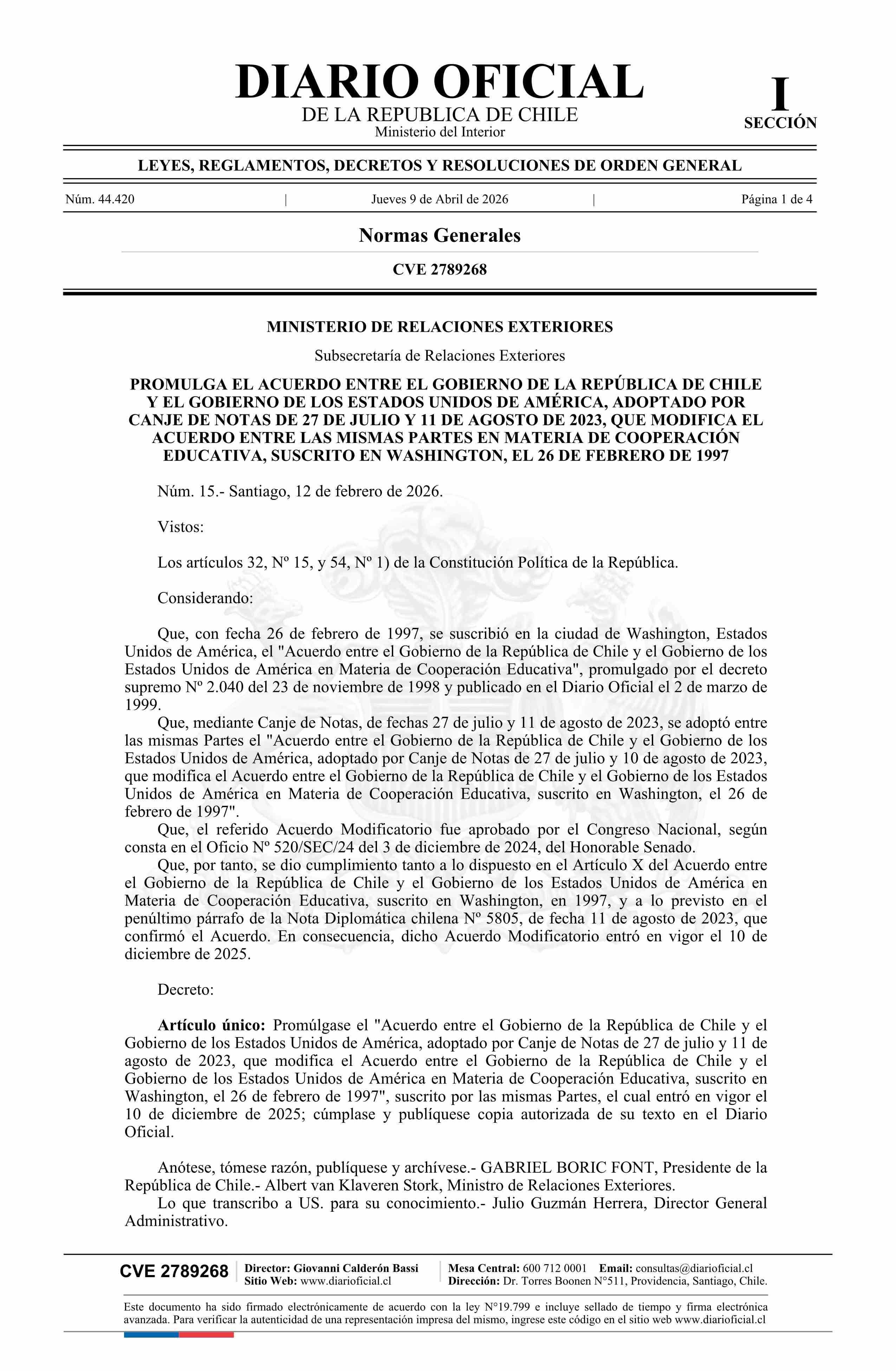 | Título: | Decreto número 15, de 2026.- Promulga el Acuerdo entre el Gobierno de la República de Chile y el Gobierno de los Estados Unidos de América, adoptado por Canje de Notas de 27 de julio y 11 de agosto de 2023, que modifica el Acuerdo entre las mismas Partes en Materia de Cooperación Educativa, suscrito |