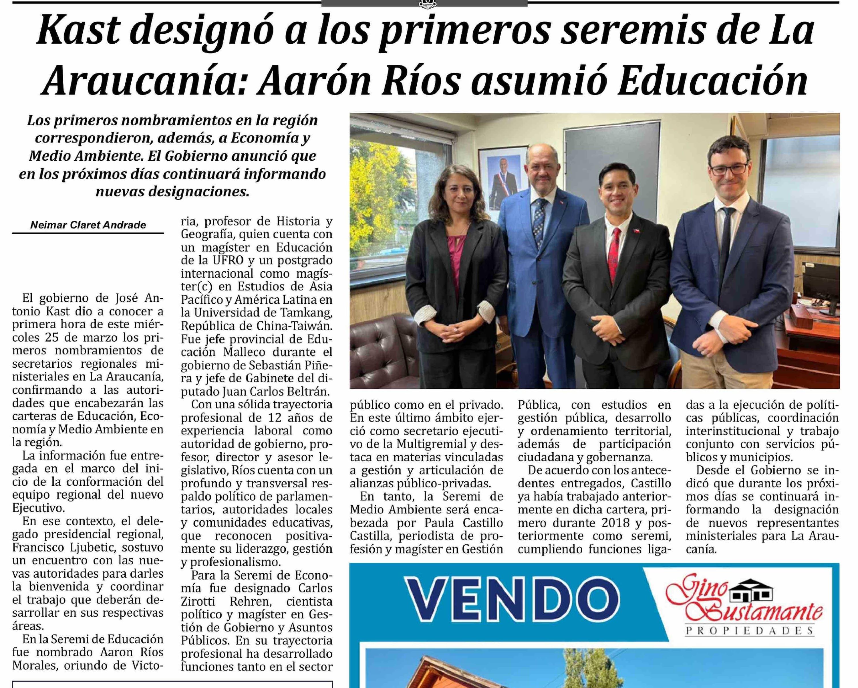 Título: Kast designó a los primeros seremis de La Araucanía: Aarón Ríos asumió Educación