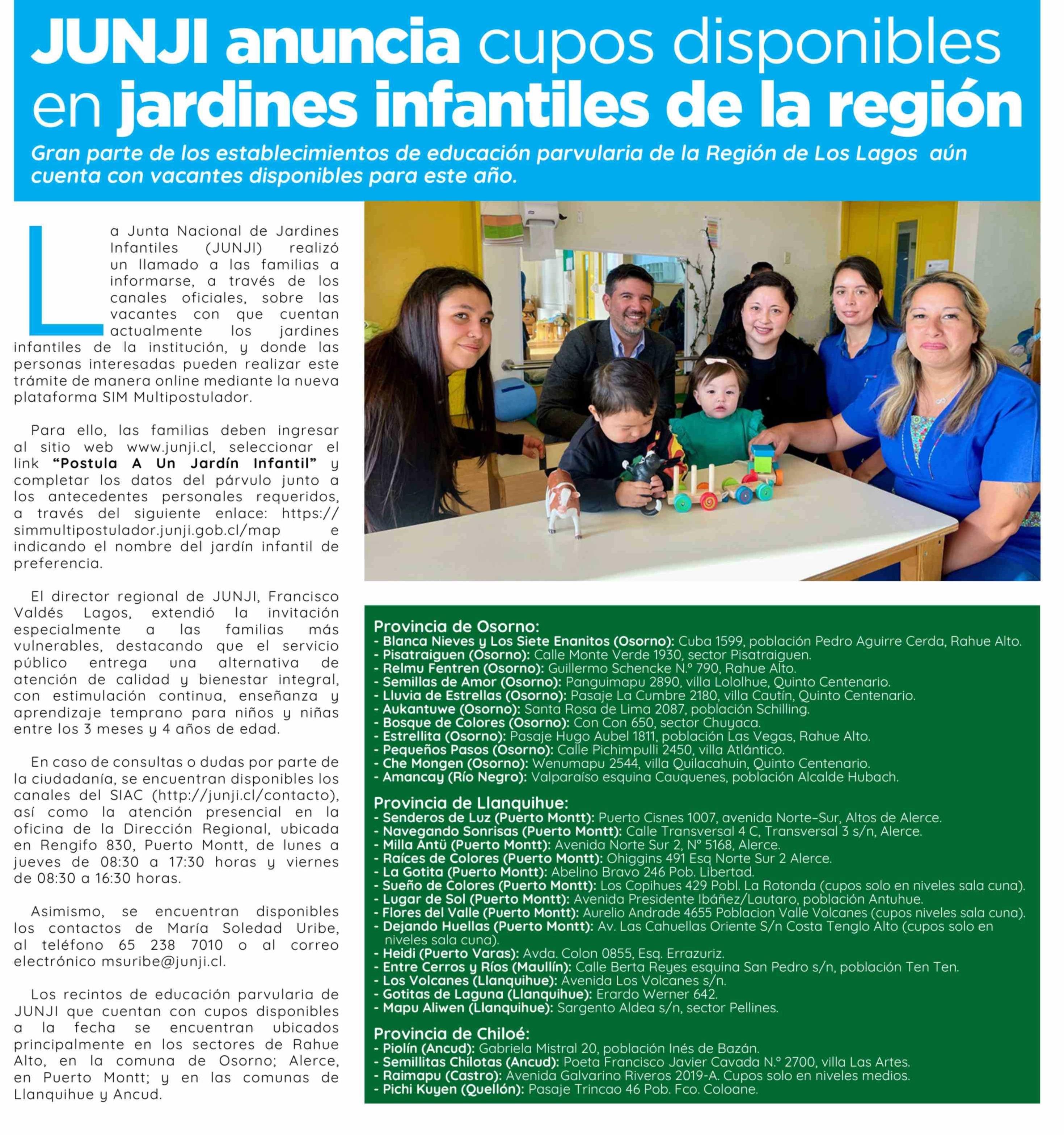 JUNJI anuncia cupos disponibles en jardines infantiles de la región
