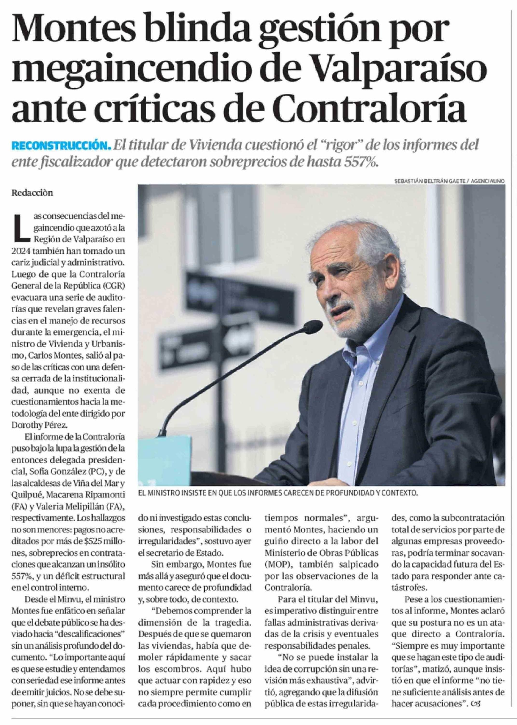 Montes blinda gestión por megaincendio de Valparaíso ante críticas de Contraloría