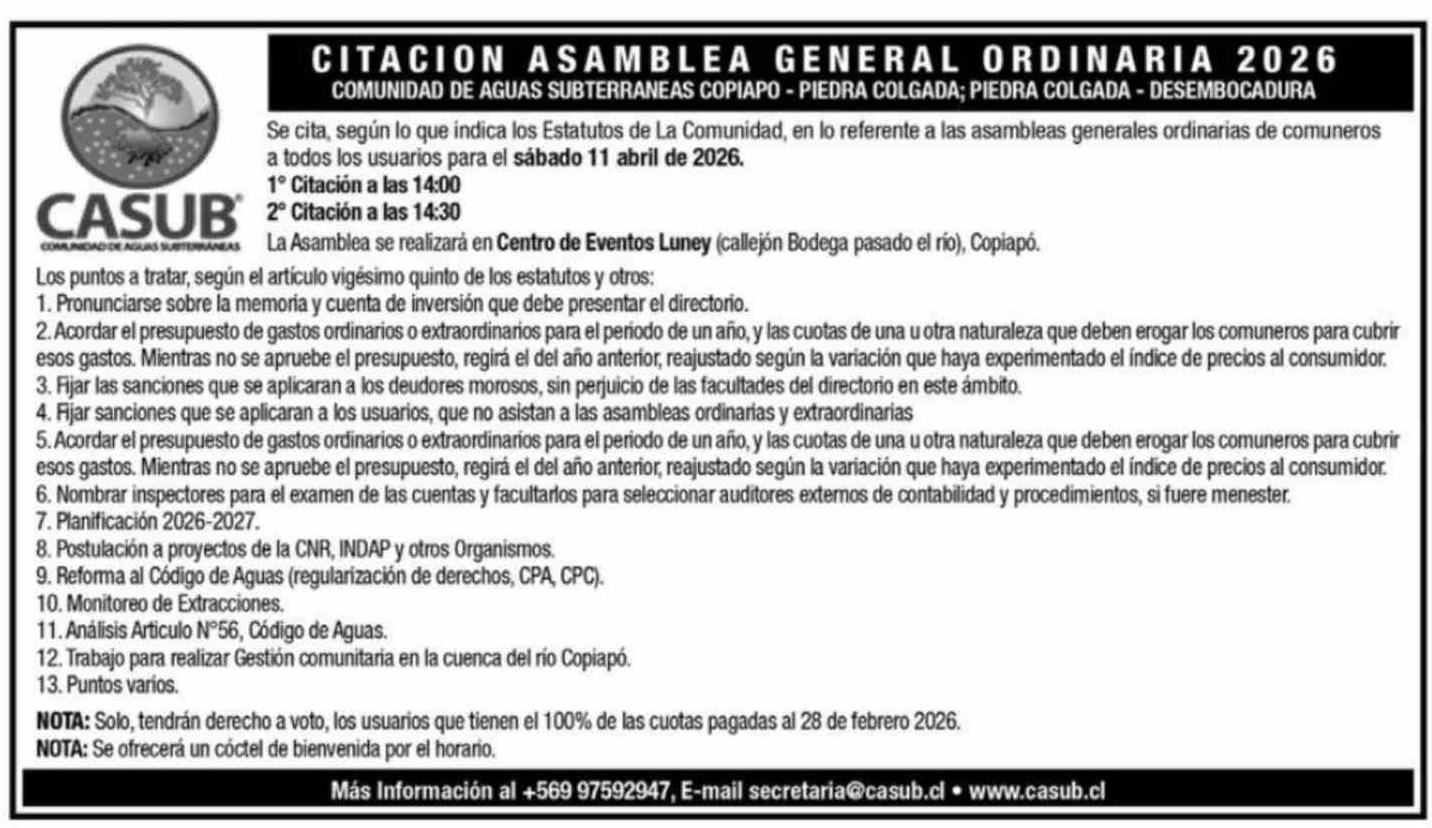 | Título: | Extractos: CITACION ASAMBLEA GENERAL ORDINARIA 2026 COMUNIDAD DE AGUAS SUBTERRANEAS COPIAPO - PIEDRA COLGADA; PIEDRA COLGADA - DESEMBOCADURA Se cita, según lo que indica los Estatutos de La Comunidad, en lo referente a las asambleas generales ordinarias de comuneros a todos los usuarios para el sába |