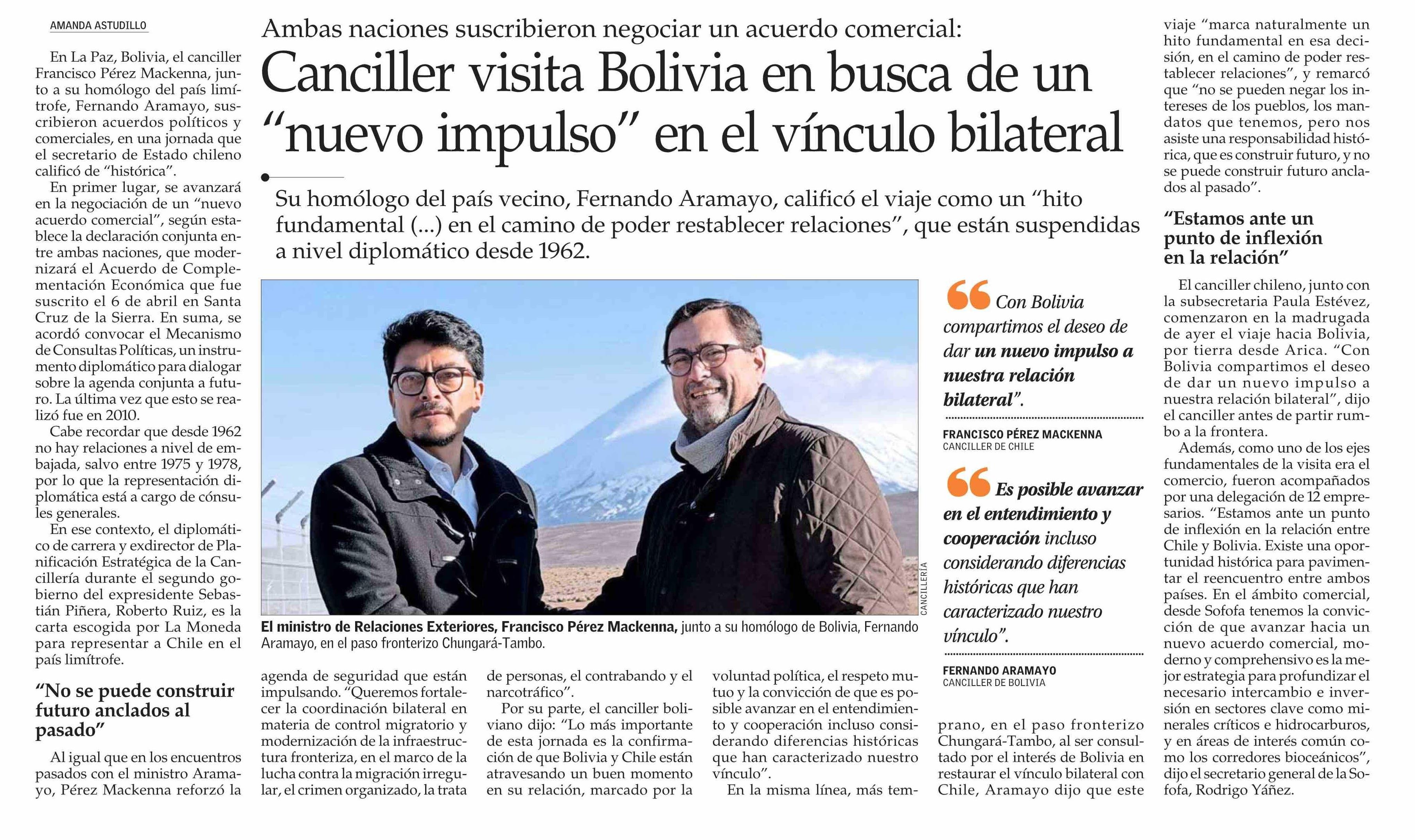 Canciller visita Bolivia en busca de un "nuevo impulso" en el vínculo bilateral